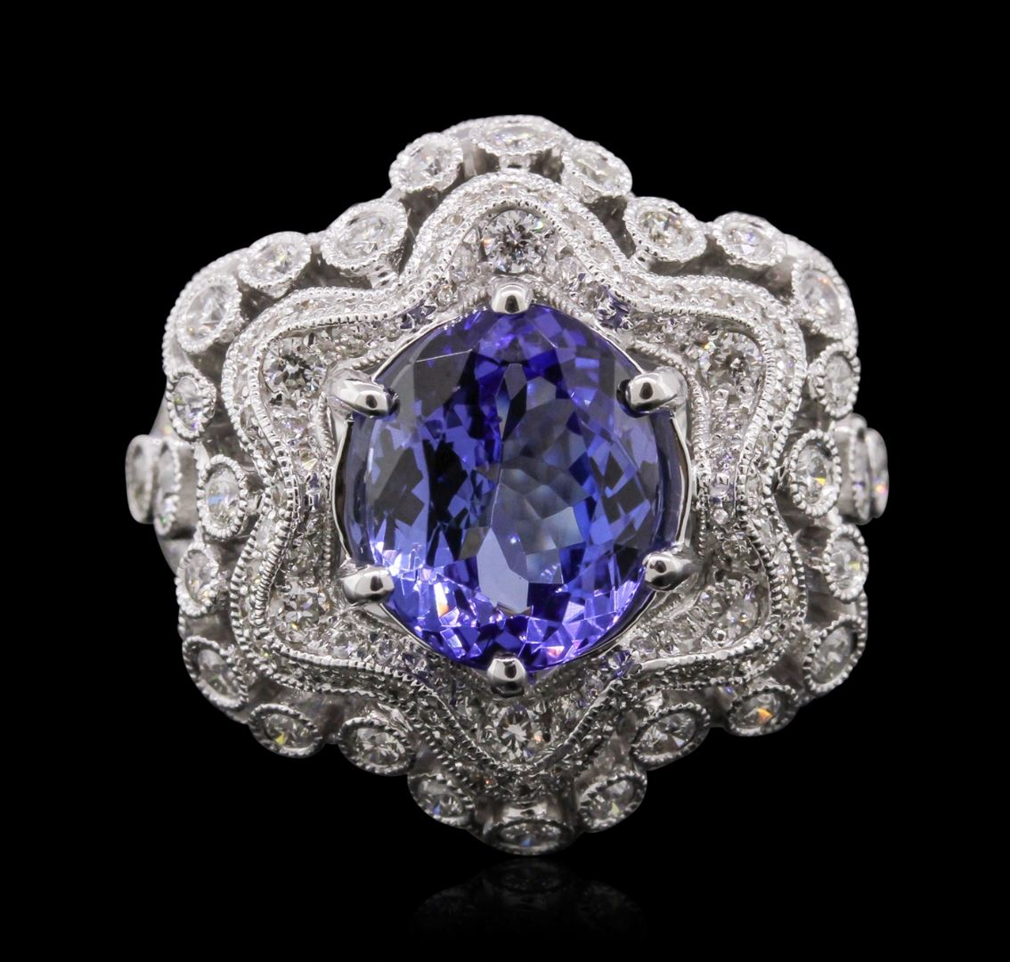 One electronically tested 18KT white gold Ladies combination cast & assembled ring with a bright polish finish. Condition is new. Identified with markings of "18K". Containing: One prong set oval modified mixed cut natural tanzanite, measuring 10.50 x 8.20 x 5.60mm, approximate weight of 3.92ct., clarity is eye clean, type II, medium, moderately strong, blue color, (GIA B 5/4), cut is very good. Colored gemstones are presumed to have been subjected to commonly used color/clarity enhancement processes. One Hundred Thirty-Five prong set round brilliant cut diamonds, measuring 2.50 - 1.30 x 1.14mm (depth est.) approximate. Total Weight of 135 Stones = 1.98ct. Clarity: SI-1 to SI-2. Color: H - I, Cut is Good. Total Weight of Colored Stones 3.92ct. Total Weight of Diamonds 1.98ct. Total Weight of Ring 13.40 grams. GGL Appraised at $16,060.00.