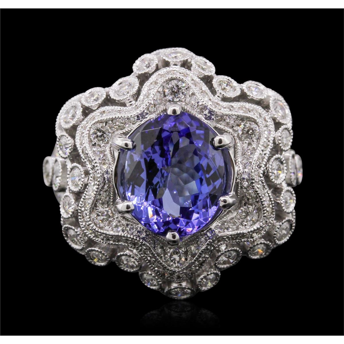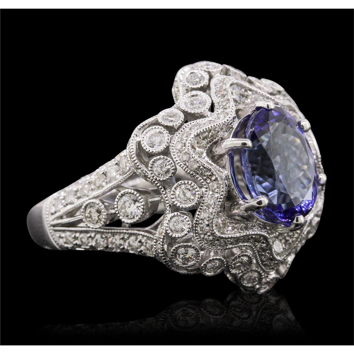 One electronically tested 18KT white gold Ladies combination cast & assembled ring with a bright polish finish. Condition is new. Identified with markings of "18K". Containing: One prong set oval modified mixed cut natural tanzanite, measuring 10.50 x 8.20 x 5.60mm, approximate weight of 3.92ct., clarity is eye clean, type II, medium, moderately strong, blue color, (GIA B 5/4), cut is very good. Colored gemstones are presumed to have been subjected to commonly used color/clarity enhancement processes. One Hundred Thirty-Five prong set round brilliant cut diamonds, measuring 2.50 - 1.30 x 1.14mm (depth est.) approximate. Total Weight of 135 Stones = 1.98ct. Clarity: SI-1 to SI-2. Color: H - I, Cut is Good. Total Weight of Colored Stones 3.92ct. Total Weight of Diamonds 1.98ct. Total Weight of Ring 13.40 grams. GGL Appraised at $16,060.00.