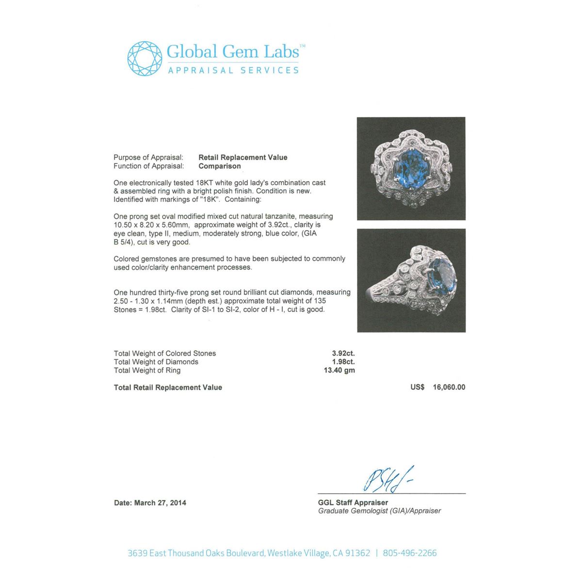 One electronically tested 18KT white gold Ladies combination cast & assembled ring with a bright polish finish. Condition is new. Identified with markings of "18K". Containing: One prong set oval modified mixed cut natural tanzanite, measuring 10.50 x 8.20 x 5.60mm, approximate weight of 3.92ct., clarity is eye clean, type II, medium, moderately strong, blue color, (GIA B 5/4), cut is very good. Colored gemstones are presumed to have been subjected to commonly used color/clarity enhancement processes. One Hundred Thirty-Five prong set round brilliant cut diamonds, measuring 2.50 - 1.30 x 1.14mm (depth est.) approximate. Total Weight of 135 Stones = 1.98ct. Clarity: SI-1 to SI-2. Color: H - I, Cut is Good. Total Weight of Colored Stones 3.92ct. Total Weight of Diamonds 1.98ct. Total Weight of Ring 13.40 grams. GGL Appraised at $16,060.00.