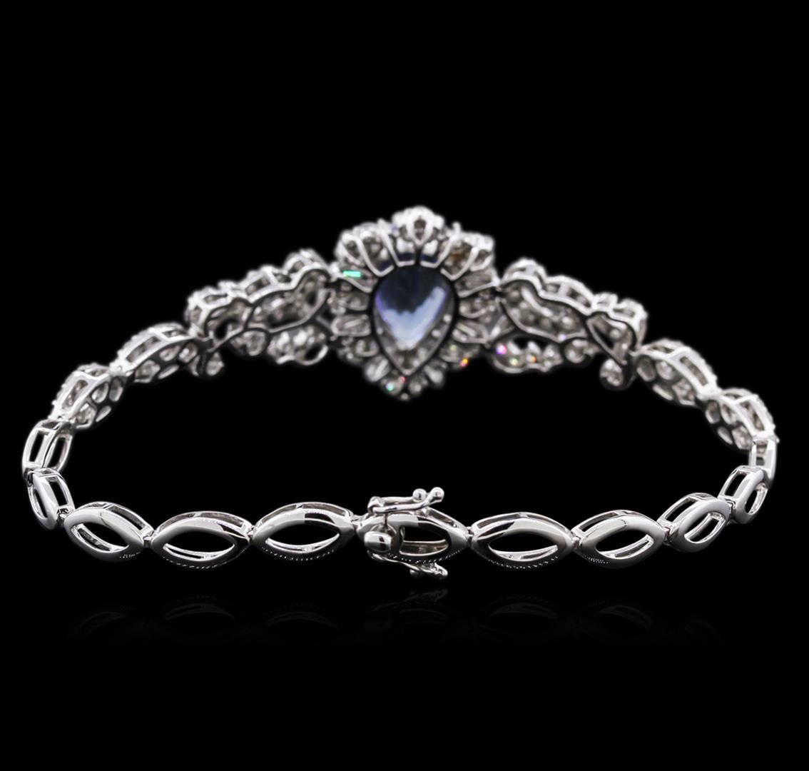 One polished, stamped, and tested 18K white gold bracelet mounted with: 1 genuine tanzanite center stone weighing 3.93 carat, and 156 genuine diamonds weighing 3.17 carats. The bracelet measures 7 inches in length and is finished with a tension lock clasp and double safety clasp. This item weighs 13.5 grams, condition is new, excellent workmanship. MAIN GEMSTONE: Variety: Tanzanite. Species: Zoisite. Shape: Pear. Cutting Style: Modified Brilliant Cut. Measurements: 14 x 9 mm. Weight: 3.93 carat. Color: Violetish Blue. Cut Grade: Very Good. Refractive Index: 1.691 - 1.700 DR. Birefringence: 0.008 - 0.013. Hardness: 6.5 - 7. ADJACENT GEMSTONES ON RING: Identity: Natural Diamond. Cut: Baguette / Round Brilliant. Quantity: 156 Diamonds. Measurements: 2.0 - 2.5 mm (12 baguette) 1.7 - 1.8 mm (144 round). Total Weight: 3.17 carats. Clarity Grade: VS2 - SI1. Color Grade: F - G. Refractive Index: 2.418. Hardness: 10. Tanzanite Weight: 3.93 ct. Total Diamond Weight: 3.17 cts. Weight of Item. 13.5 grams. Gold Content: 18K White Gold. AIGL Appraised at $21,150.00.