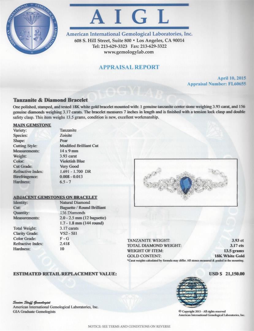 One polished, stamped, and tested 18K white gold bracelet mounted with: 1 genuine tanzanite center stone weighing 3.93 carat, and 156 genuine diamonds weighing 3.17 carats. The bracelet measures 7 inches in length and is finished with a tension lock clasp and double safety clasp. This item weighs 13.5 grams, condition is new, excellent workmanship. MAIN GEMSTONE: Variety: Tanzanite. Species: Zoisite. Shape: Pear. Cutting Style: Modified Brilliant Cut. Measurements: 14 x 9 mm. Weight: 3.93 carat. Color: Violetish Blue. Cut Grade: Very Good. Refractive Index: 1.691 - 1.700 DR. Birefringence: 0.008 - 0.013. Hardness: 6.5 - 7. ADJACENT GEMSTONES ON RING: Identity: Natural Diamond. Cut: Baguette / Round Brilliant. Quantity: 156 Diamonds. Measurements: 2.0 - 2.5 mm (12 baguette) 1.7 - 1.8 mm (144 round). Total Weight: 3.17 carats. Clarity Grade: VS2 - SI1. Color Grade: F - G. Refractive Index: 2.418. Hardness: 10. Tanzanite Weight: 3.93 ct. Total Diamond Weight: 3.17 cts. Weight of Item. 13.5 grams. Gold Content: 18K White Gold. AIGL Appraised at $21,150.00.