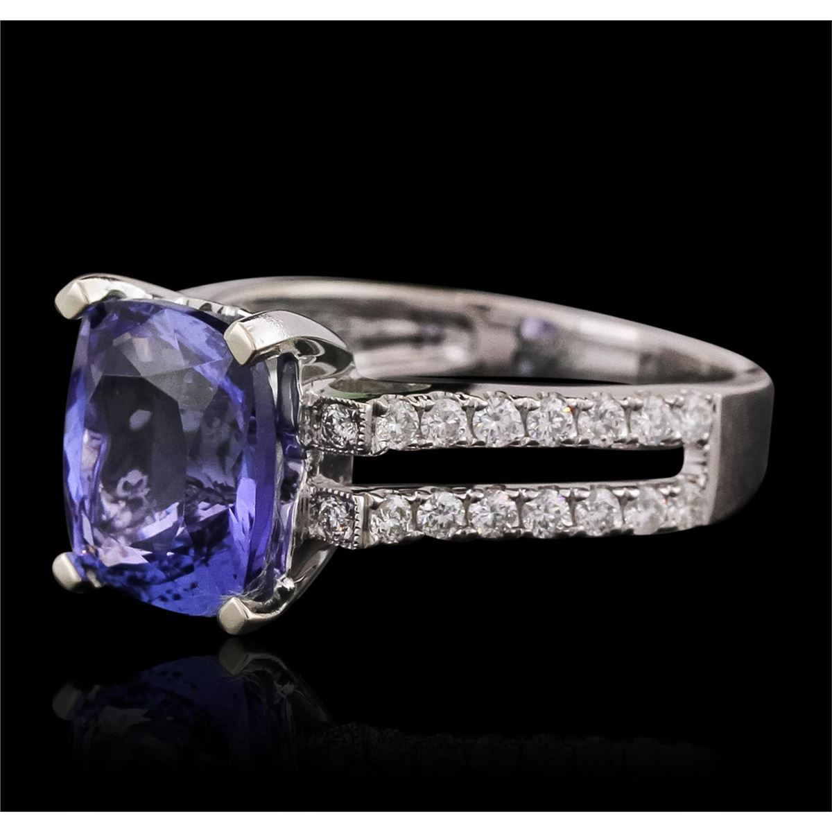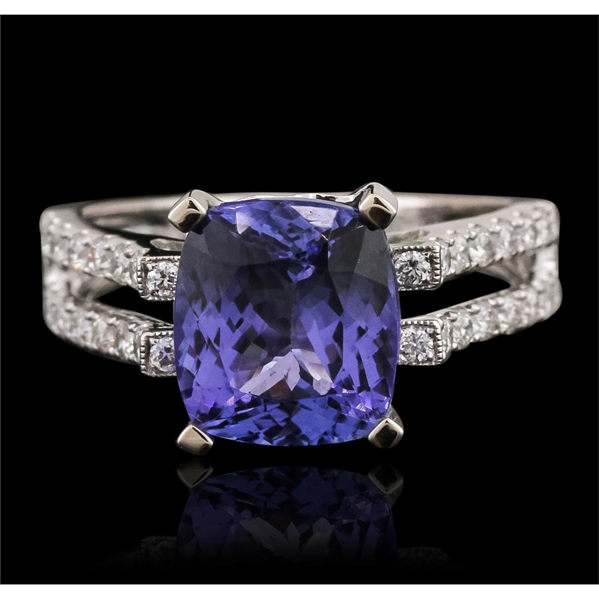 One electronically tested 18KT white gold ladies combination cast & assembled ring with a bright polish finish. Identified with markings of "750". Condition is new. Containing: One prong set rectangular cushion modified brilliant cut natural tanzanite, measuring 9.82 x 8.86 x 5.76mm, approximate weight of 3.95ct., clarity is eye clean, type I, medium, moderately strong, bluish violet color, (GIA bV 5/4), cut is good. Thirty-Two prong set round brilliant cut diamonds, measuring 1.50 - 1.50 x 0.90mm (depth est.) approximate total weight of 32 Stones = 0.39ct. Clarity: SI-1 to I-1. Color: H - I, Cut is Good. Colored gemstones are presumed to have been subjected to commonly used enhancement processes. All diamonds and colored gemstones are graded in the mounting, unless otherwise stated. Total Weight of Colored Stones 3.95ct. Total Weight of Diamonds 0.39ct. Total Weight of Ring 5.20 grams. GGL Appraised at $9,245.00.