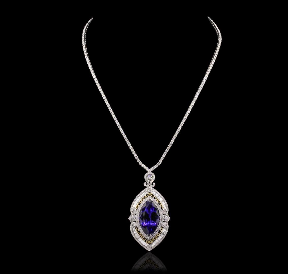 One electronically tested 18KT white gold ladies cast & assembled tanzanite and diamond necklace. Condition is new, good workmanship. The necklace features a tanzanite set within an elaborate diamond lattice supported by a seventeen inch length diamond ribbon transitioning into matching white gold links, terminating in a concealed clasp with safety. Bright polish finish with yellow gold accents and milgrain detailing. Identified with markings of "750". Containing: One prong set marquise mixed cut natural tanzanite, measuring 29.50 x 15.00 x 11.50mm, approximate weight of 33.29ct., clarity is eye clean, type I, dark, moderately strong, violetish blue color, (GIA vB 7/4), cut is good. Transmitting light with no distortion, transparent. Colored Stone Grading Report attached. Graded in the setting. Tanzanite is a very rare gemstone that is only found in the country of Tanzania. Originally discovered in 1967. Tiffany & Company, named the stone Tanzanite. It is found in the Usumburu Mountains that border the Umba Valley of northern Tanzania. Tanzanite occurs in gray, brown, violet, blue, reddish-purple, & green. The gem is interesting because of its exceptional pleochroism. Rotated in different directions a tanzanite will exhibit multiple changes of color. Tanzanite has a low tolerance to ultrasonic cleaning, and should not be cleaned using this method. Two Hundred Two prong set round brilliant cut diamonds approximate total weight of 202 Stones = 2.64ct. Graded in the setting. Clarity: VS-2 to SI-2. Color: G - I Eighty channel set baguette cut diamonds approximate total weight of 80 Stones = 2.51ct. Graded in the setting. Clarity: VS-1 to SI-1. Color: G - I. Total Weight of Colored Stones 33.29ct. Total Weight of Diamonds 5.15ct. Total Weight of Necklace 41.56 grams. AIG Appraised at $111,620.00.