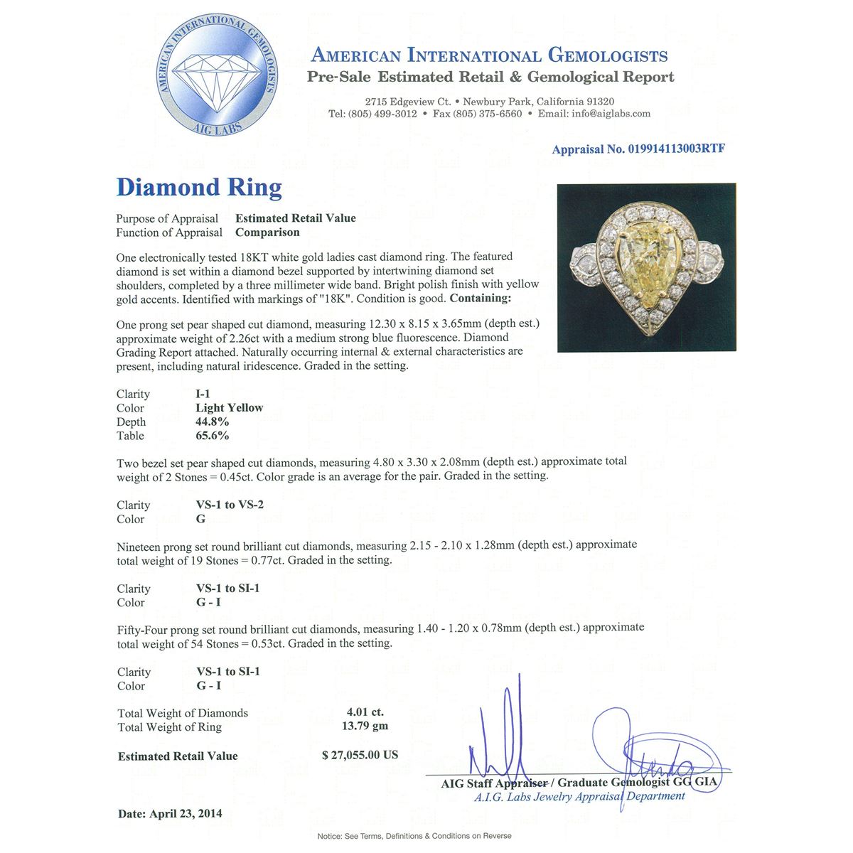 One electronically tested 18KT white gold ladies cast diamond ring. The featured diamond is set within a diamond bezel supported by intertwining diamond set shoulders, completed by a three millimeter wide band. Bright polish finish with yellow gold accents. Identified with markings of "18K". Condition is good. Containing: One prong set pear shaped cut diamond, measuring 12.30 x 8.15 x 3.65mm (depth est.) approximate weight of 2.26ct with a medium strong blue fluorescence. Diamond Grading Report attached. Naturally occurring internal & external characteristics are present, including natural iridescence. Graded in the setting. Clarity: I-1. Depth: 44.8%. Table 65.6%. Two bezel set pear shaped cut diamonds, measuring 4.80 x 3.30 x 2.08mm (depth est.) approximate. Total Weight of 2 Stones = 0.45ct. Color grade is an average for the pair. Graded in the setting. Clarity: VS-1 to VS-2. Color: G Nineteen prong set round brilliant cut diamonds, measuring 2.15 - 2.10 x 1.28mm (depth est.) approximate. Total Weight of 19 Stones = 0.77ct. Graded in the setting. Clarity: VS-1 to SI-1. Color: G - I Fifty-Four prong set round brilliant cut diamonds, measuring 1.40 - 1.20 x 0.78mm (depth est.) approximate. Total Weight of 54 Stones = 0.53ct. Graded in the setting. Clarity: VS-1 to SI-1. Color: G - I. Total Weight of Diamonds 4.01ct. Total Weight of Ring 13.79 grams. AIG Appraised at $27,055.00.