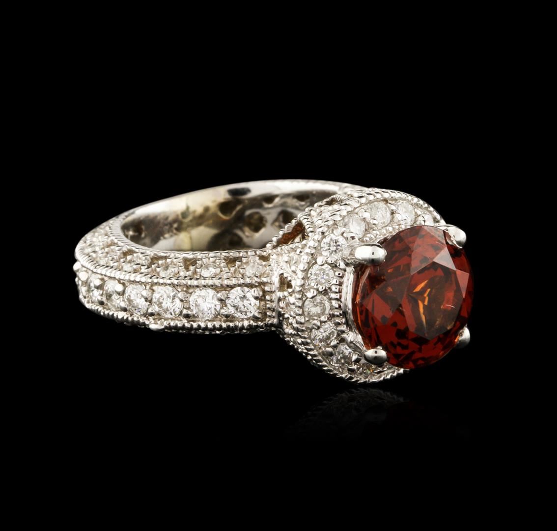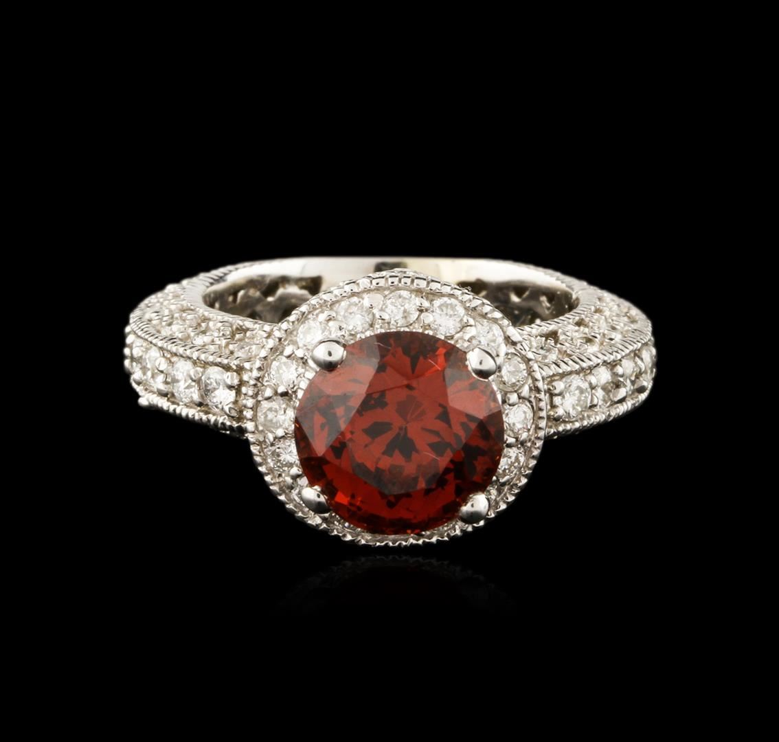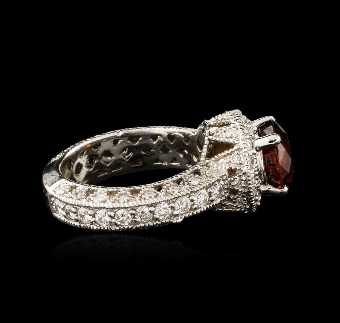 One electronically tested 18KT white gold ladies cast garnet and diamond ring with a bright polish finish. Identified with markings of "18K". Condition is new. Containing: One prong set round modified brilliant cut natural almandite garnet, measuring 9.30 - 9.30 x 6.05 mm, approximate weight of 4.24ct., clarity is eye clean, type II, medium, very slightly brownish, reddish orange color, (GIA rO 5/3), cut is good. Twenty prong set round brilliant cut diamonds, measuring 2.00 - 2.00 x 1.20mm (depth est.) approximate total weight of 20 Stones = 0.58ct. Clarity: SI-1 to SI-2. Color: I - J, Cut is Good. Sixty-Five prong set round brilliant cut diamonds, measuring 1.50 - 1.30 x 0.84mm (depth est.) approximate total weight of 65 Stones = 0.65ct. Clarity: SI-2 to I-2. Color: H - I, Cut is Good. Colored gemstones are presumed to have been subjected to commonly used enhancement processes. All diamonds and colored gemstones are graded in the mounting, unless otherwise stated. Total Weight of Colored Stones 4.24ct. Total Weight of Diamonds 1.23ct. Total Weight of Ring 11.60 grams. GGL Appraised at $4,645.00.