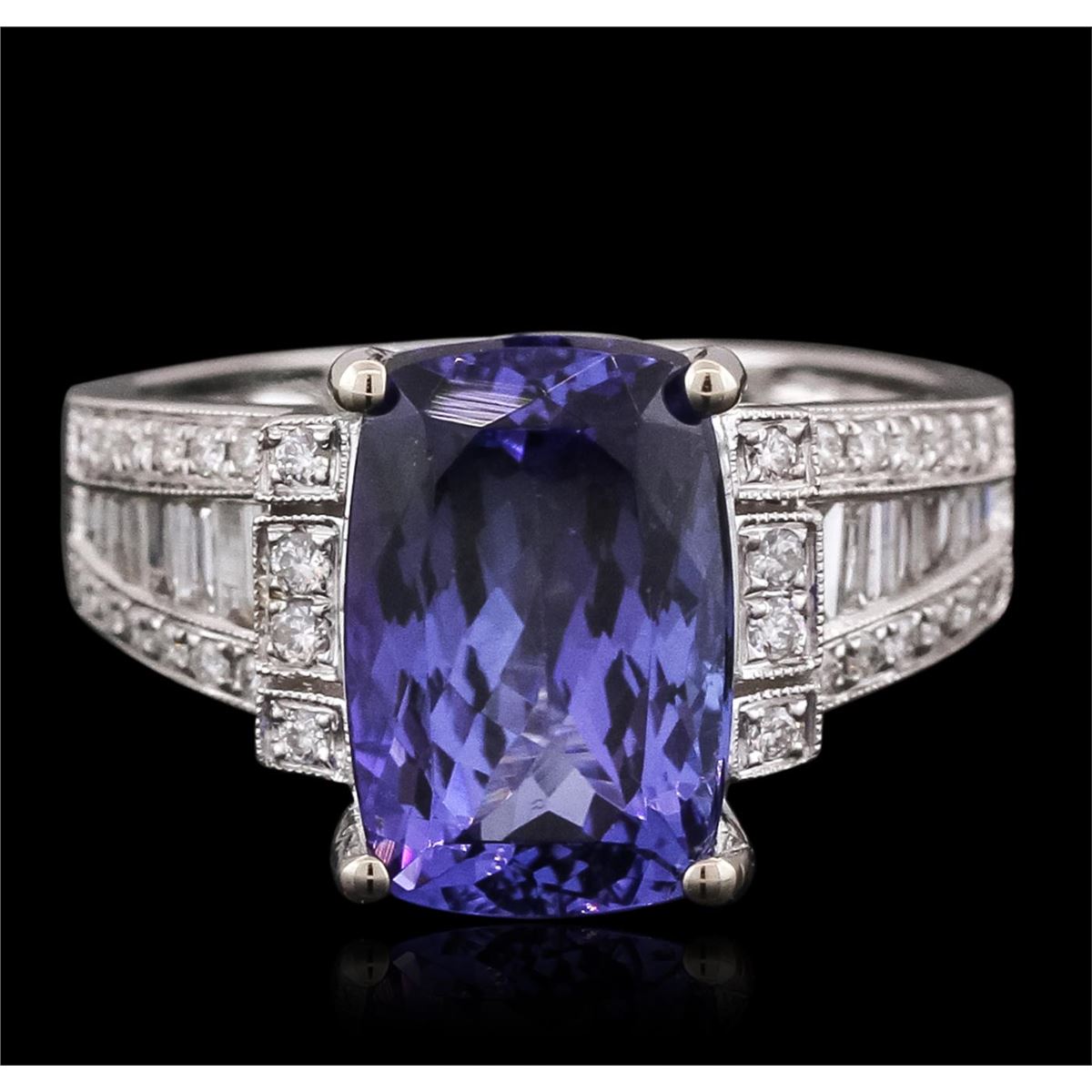 One electronically tested 18KT white gold ladies combination cast & assembled prong set ring with a tapered shank with a bright polish finish. Identified with markings of "750 18K". Condition is new. Containing: One prong set rectangular cushion modified brilliant cut natural tanzanite, measuring 12.03 x 8.04 x 5.59mm, approximate weight of 4.26ct., clarity is eye clean, type I, medium light, very slightly grayish, bluish violet color, (GIA bV 4/3), cut is good. Forty prong set round brilliant cut diamonds, measuring 1.00 - 1.00 x 0.60mm (depth est.) approximate total weight of 40 Stones = 0.26ct. Clarity: SI-2 to I-1. Color: G - H, Cut is Good. Seventeen channel set baguette cut diamonds, measuring from 1.00 x 1.00 x 0.85mm (depth est.) to 2.50 x 1.30 x 1.11mm (depth est.) approximate total weight of 17 Stones = 0.29ct. Clarity: VS-2 to SI-1. Color: H - I, Cut is Good. All diamonds are graded in the mounting, unless otherwise stated, Colored gemstones are presumed to have been subjected to commonly used enhancement processes. Total Weight of Colored Stones 4.26ct. Total Weight of Diamonds 0.55ct. Total Weight of Ring 7.00 grams. GGL Appraised at $10,520.00.