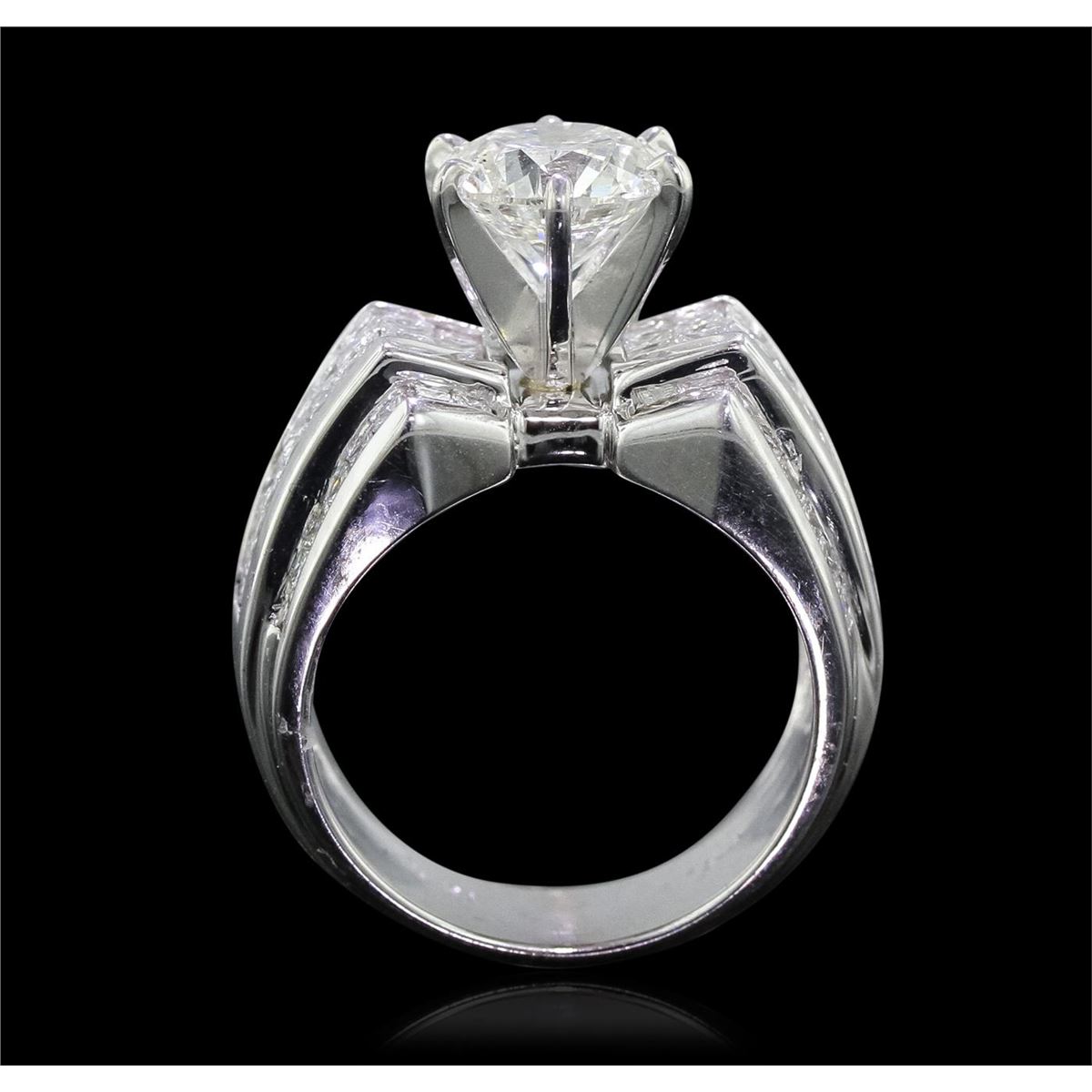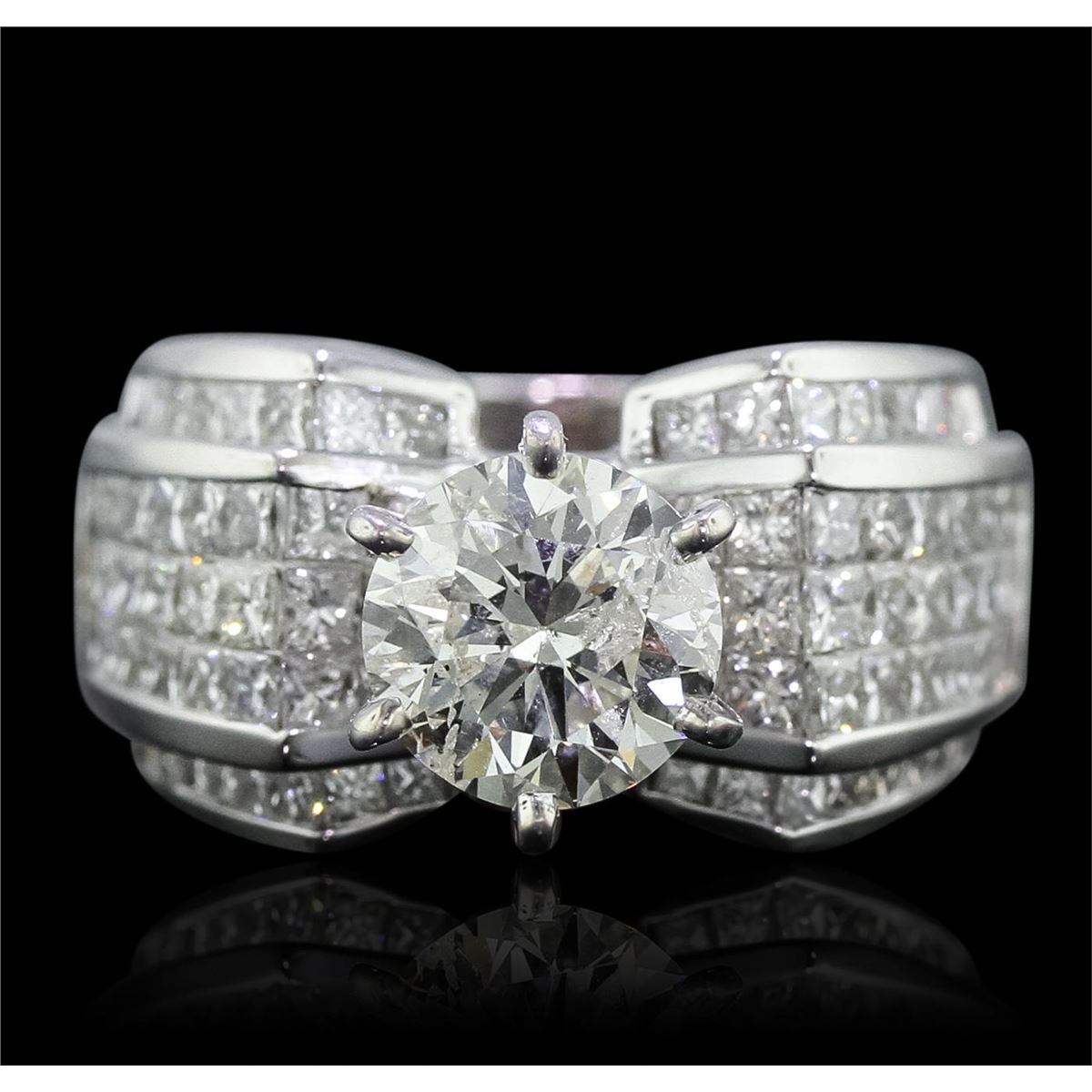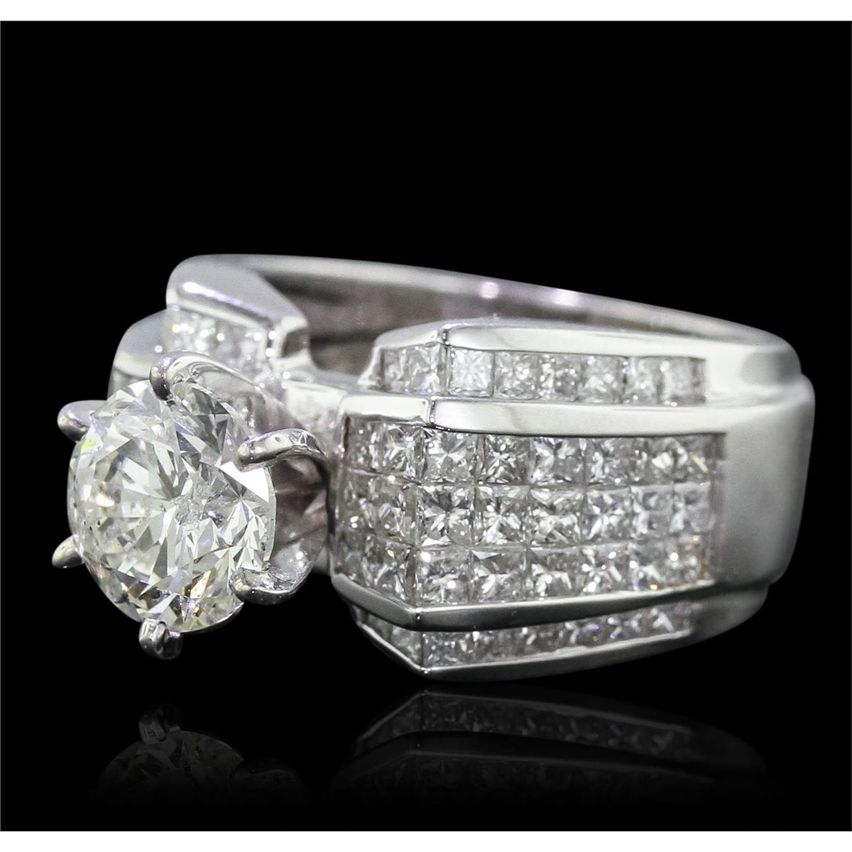 One electronically tested 18KT white gold Ladies combination cast & assembled engagement ring with a bright polish finish. Condition is new. Identified with markings of "18K". Containing: One prong set round brilliant cut diamond, measuring 7.81 - 7.74 x 5.50mm (depth est.) approximate weight of 2.02ct. Clarity: I-2. Color: J, Cut is Good. Eighty invisible set round brilliant cut diamonds, measuring 1.90 - 1.50 x 1.02mm (depth est.) approximate. Total Weight of 80 Stones = 2.33ct. Clarity: SI-1 to SI-2. Color: I - J, Cut is Good. Diamonds graded in the mounting. Total Weight of Diamonds 4.35ct. Total Weight of Ring 14.20 grams. GGL Appraised at $33,515.00.