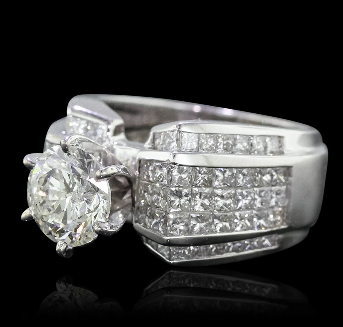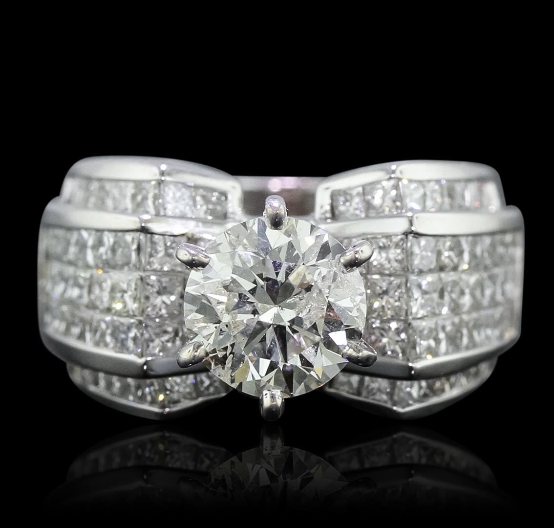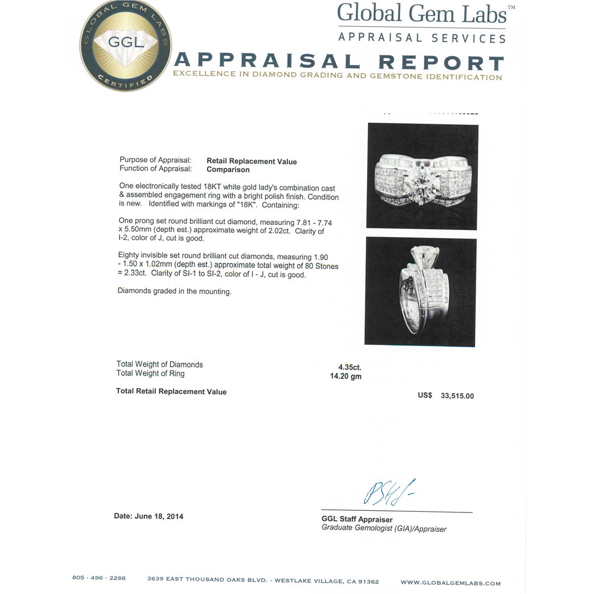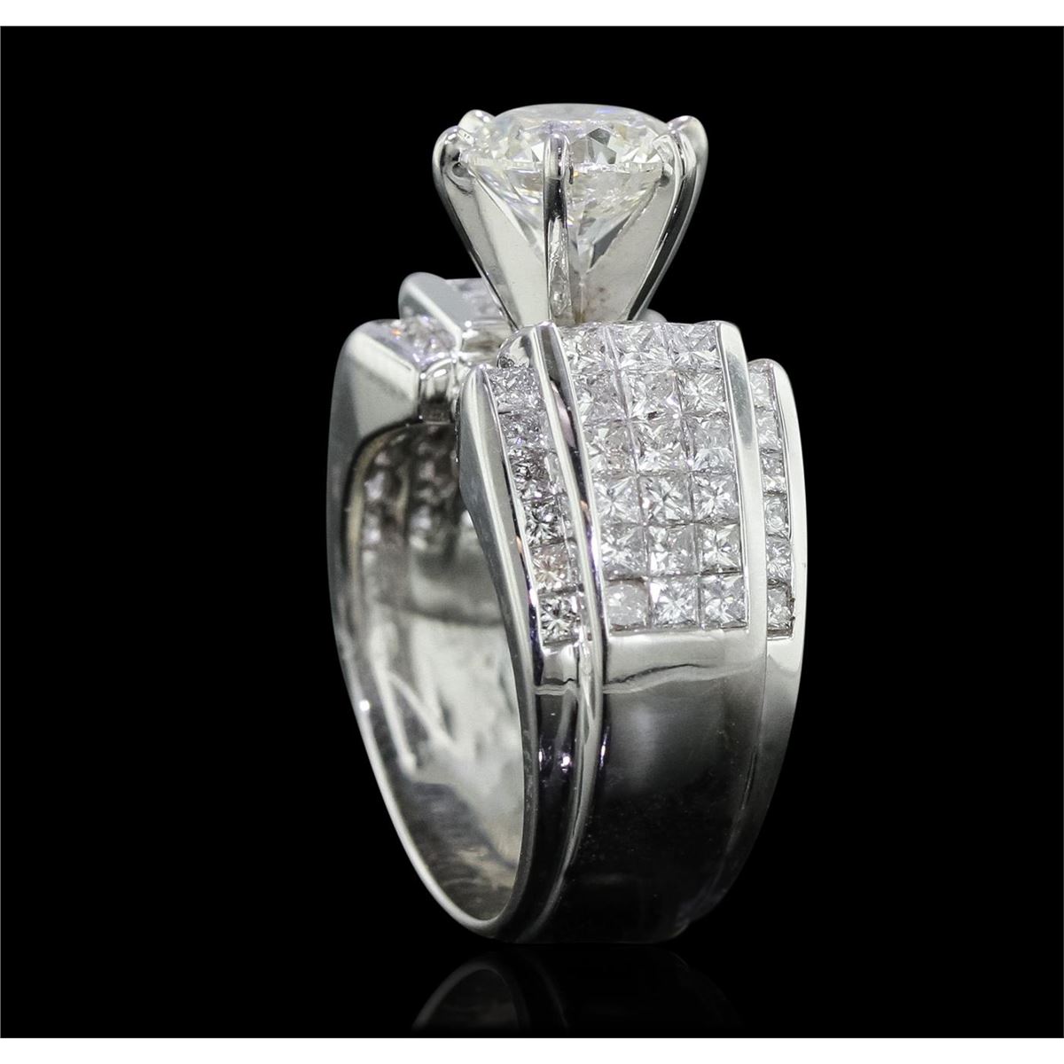 One electronically tested 18KT white gold Ladies combination cast & assembled engagement ring with a bright polish finish. Condition is new. Identified with markings of "18K". Containing: One prong set round brilliant cut diamond, measuring 7.81 - 7.74 x 5.50mm (depth est.) approximate weight of 2.02ct. Clarity: I-2. Color: J, Cut is Good. Eighty invisible set round brilliant cut diamonds, measuring 1.90 - 1.50 x 1.02mm (depth est.) approximate. Total Weight of 80 Stones = 2.33ct. Clarity: SI-1 to SI-2. Color: I - J, Cut is Good. Diamonds graded in the mounting. Total Weight of Diamonds 4.35ct. Total Weight of Ring 14.20 grams. GGL Appraised at $33,515.00.