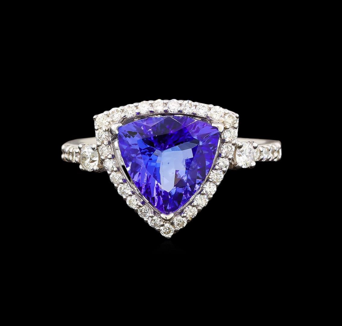 One electronically tested 18KT white gold ladies cast tanzanite and diamond ring with a flat shank with a bright polish finish. Trademark is Orianne. Identified with markings of "18K". Condition is new. Containing: One prong set triangle modified brilliant cut natural tanzanite, measuring 11.00 x 11.00 x 6.05mm, approximate weight of 4.41ct., clarity is eye clean, type I, medium, very slightly grayish, violet color, (GIA V 5/3), cut is good. Fifty-One prong set round brilliant cut diamonds, measuring 1.30 - 1.30 x 0.78mm (depth est.) approximate total weight of 51 Stones = 0.41ct. Clarity: SI-2 to I-1. Color: I - J, Cut is Good. Two prong set round brilliant cut diamonds, measuring 2.50 - 2.50 x 1.50mm (depth est.) approximate total weight of 2 Stones = 0.11ct. Clarity: SI-1. Color: I - J. All diamonds and colored gemstones are graded in the mounting, unless otherwise stated. Colored gemstones are presumed to have been subjected to commonly used enhancement processes. Total Weight of Colored Stones 4.41ct. Total Weight of Diamonds 0.52ct. Total Weight of Ring 3.90 grams. GGL Appraised at $5,160.00.