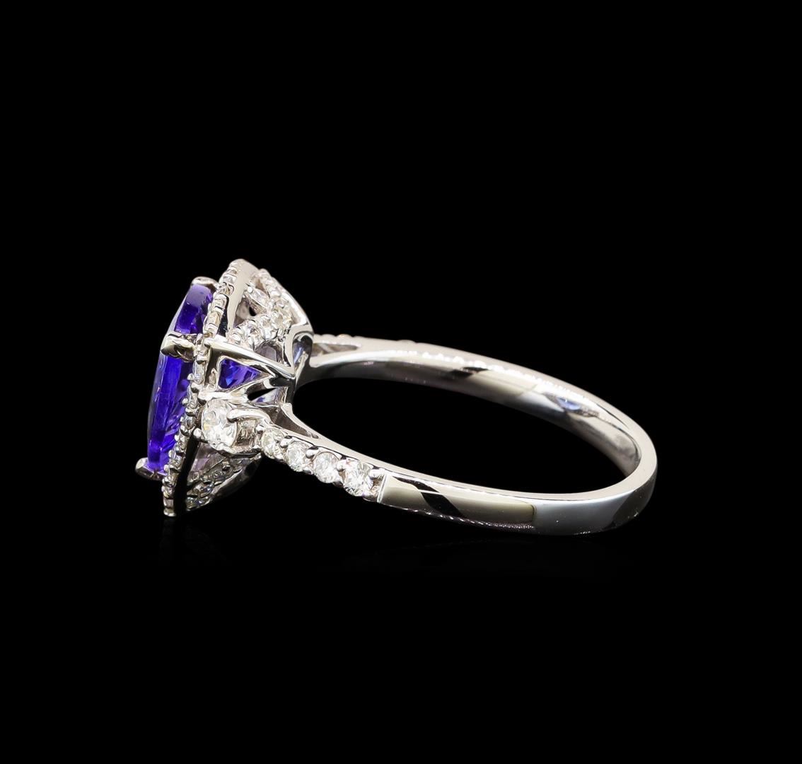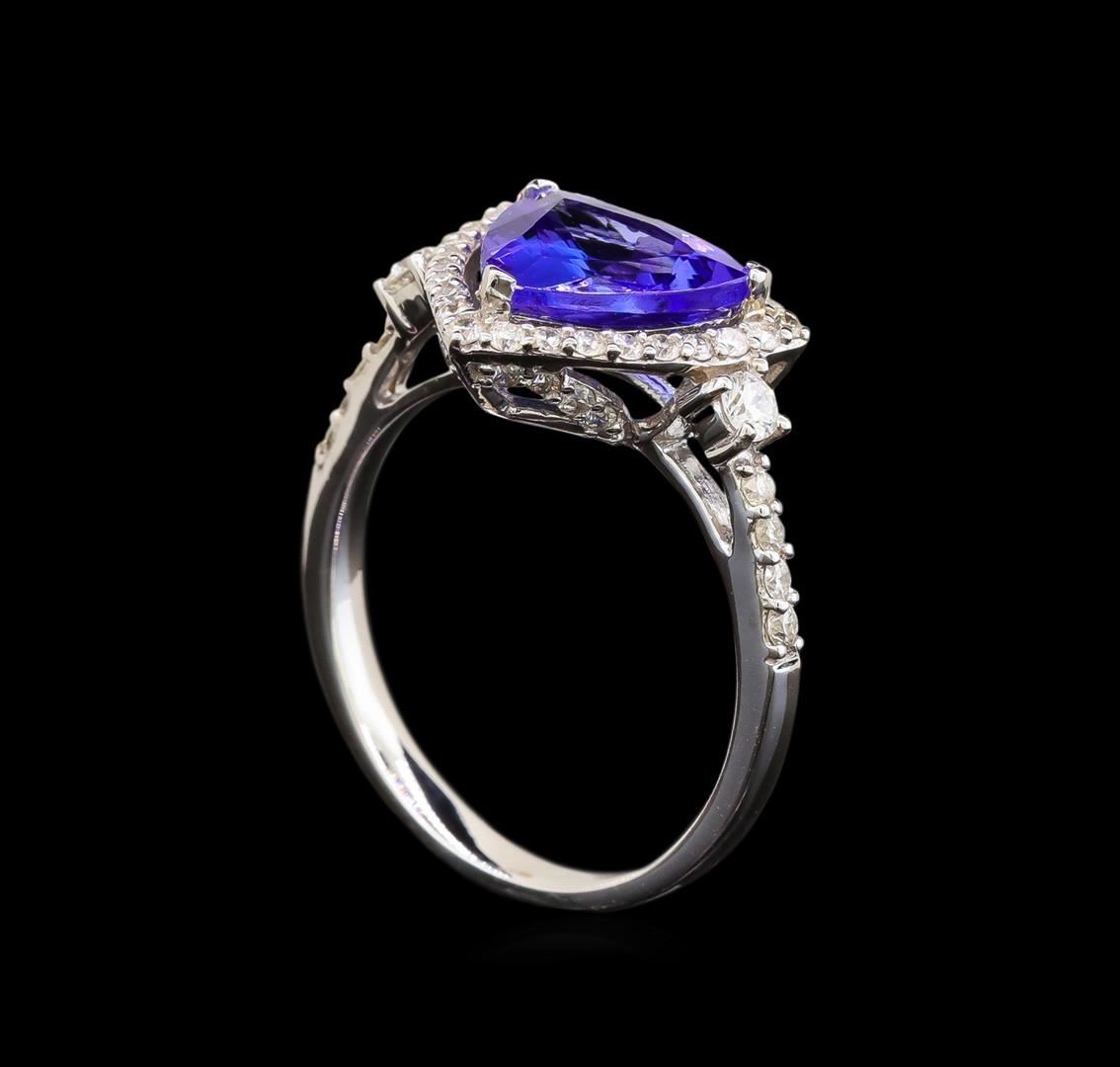 One electronically tested 18KT white gold ladies cast tanzanite and diamond ring with a flat shank with a bright polish finish. Trademark is Orianne. Identified with markings of "18K". Condition is new. Containing: One prong set triangle modified brilliant cut natural tanzanite, measuring 11.00 x 11.00 x 6.05mm, approximate weight of 4.41ct., clarity is eye clean, type I, medium, very slightly grayish, violet color, (GIA V 5/3), cut is good. Fifty-One prong set round brilliant cut diamonds, measuring 1.30 - 1.30 x 0.78mm (depth est.) approximate total weight of 51 Stones = 0.41ct. Clarity: SI-2 to I-1. Color: I - J, Cut is Good. Two prong set round brilliant cut diamonds, measuring 2.50 - 2.50 x 1.50mm (depth est.) approximate total weight of 2 Stones = 0.11ct. Clarity: SI-1. Color: I - J. All diamonds and colored gemstones are graded in the mounting, unless otherwise stated. Colored gemstones are presumed to have been subjected to commonly used enhancement processes. Total Weight of Colored Stones 4.41ct. Total Weight of Diamonds 0.52ct. Total Weight of Ring 3.90 grams. GGL Appraised at $5,160.00.