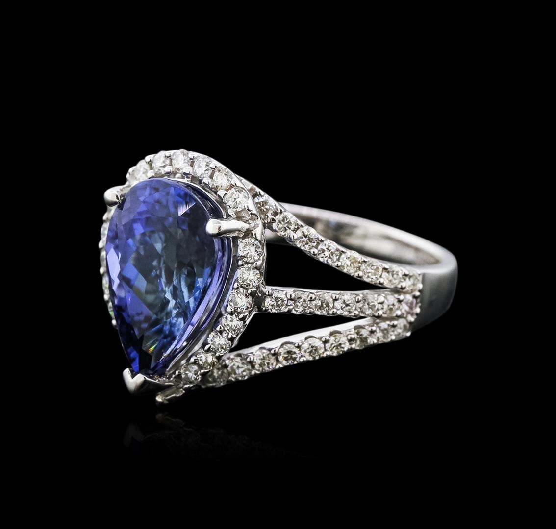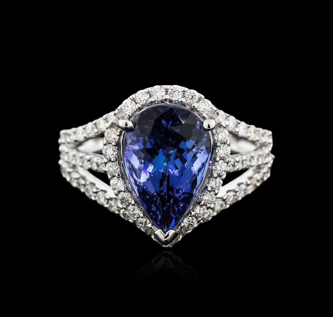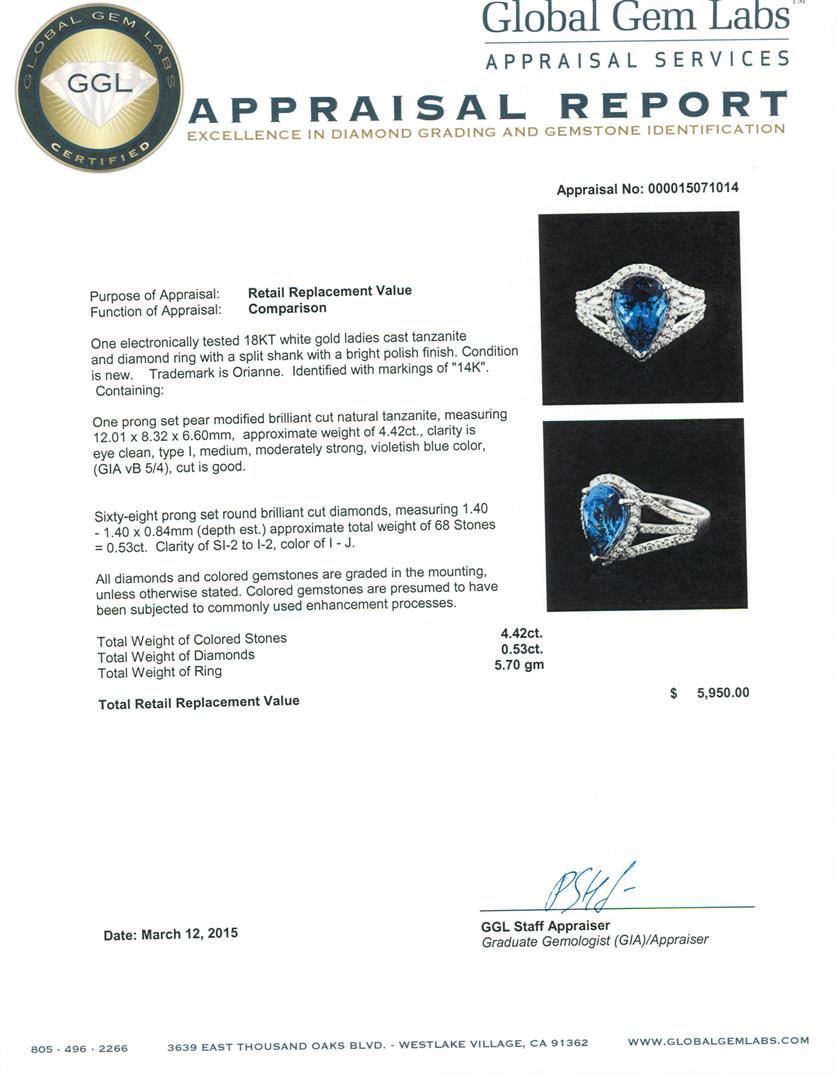 One electronically tested 18KT white gold ladies cast tanzanite and diamond ring with a split shank with a bright polish finish. Trademark is Orianne. Identified with markings of "14K". Condition is new. Containing: One prong set pear modified brilliant cut natural tanzanite, measuring 12.01 x 8.32 x 6.60mm, approximate weight of 4.42ct., clarity is eye clean, type I, medium, moderately strong, violetish blue color, (GIA vB 5/4), cut is good. Sixty-Eight prong set round brilliant cut diamonds, measuring 1.40 - 1.40 x 0.84mm (depth est.) approximate total weight of 68 Stones = 0.53ct. Clarity: SI-2 to I-2. Color: I - J. All diamonds and colored gemstones are graded in the mounting, unless otherwise stated. Colored gemstones are presumed to have been subjected to commonly used enhancement processes. Total Weight of Colored Stones 4.42ct. Total Weight of Diamonds 0.53ct. Total Weight of Ring 5.70 grams. GGL Appraised at $5,950.00.