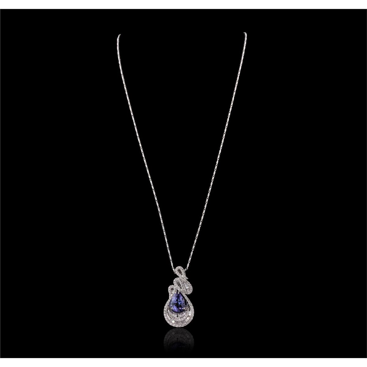 One electronically tested 18KT White Gold ladies cast & assembled tanzanite and diamond pendant with chain. The pendant features a tanzanite set within intertwining diamond ribbons, completed by a diamond set hidden bail. The pendant is supported by an eighteen inch length 14KT White Gold designer style chain, terminating in a lobster claw clasp. Bright polish finish with milgrain detailing. Identified with markings of "18K 750". Condition is new, good workmanship. Containing: One prong set pear brilliant cut natural tanzanite, measuring 12.50 x 8.80 x 5.70mm, 8% bulge factor, approximate weight of 4.54ct., clarity is eye clean, type I, medium dark, very slightly grayish, bluish violet color, (GIA bV 6/3), cut is good. Transmitting light with no distortion, transparent. Graded in the setting. Tanzanite is a very rare gemstone that is only found in the country of Tanzania. Originally discovered in 1967. Tiffany & Company, named the stone Tanzanite. It is found in the Usumburu Mountains that border the Umba Valley of northern Tanzania. Tanzanite occurs in gray, brown, violet, blue, reddish-purple, & green. The gem is interesting because of its exceptional pleochroism. Rotated in different directions a tanzanite will exhibit multiple changes of color. Tanzanite has a low tolerance to ultrasonic cleaning, and should not be cleaned using this method. One Hundred Forty-Seven prong and channel set round brilliant & baguette cut diamonds approximate total weight of 147 Stones = 2.37ct. Graded in the setting. Clarity: VS-1 to SI-1. Color: G - I. Total Weight of Colored Stones 4.54ct. Total Weight of Diamonds 2.37ct. Total Weight of Pendant With Chain 10.38 grams. AIG Appraised at $21,990.00.
