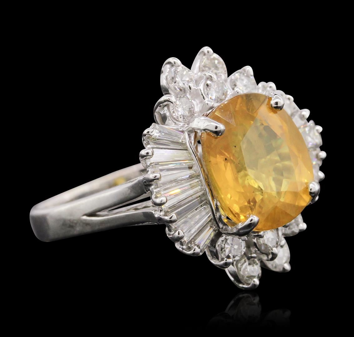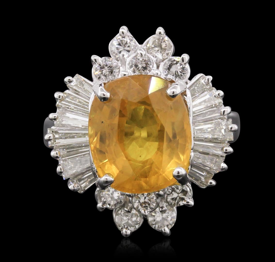 One electronically tested 18KT white gold Ladies combination cast & assembled ring with a bright polish finish. Condition is new. Containing: One prong set oval modified brilliant cut natural yellow sapphire, measuring 10.60 x 9.10 x 5.93mm, approximate weight of 4.60ct., clarity is eye clean, type II, medium light, brownish, yellow color, (GIA Y 4/3), cut is good. Colored gemstones are presumed to have been subjected to commonly used color/clarity enhancement processes. Fourteen prong set baguette cut diamonds, measuring from 3.00 x 1.30 x 1.11mm (depth est.) to 4.00 x 1.50 x 1.28mm (depth est.) approximate. Total Weight of 14 Stones = 0.75ct. Clarity: SI-1. Color: I - J, Cut is Good. Ten prong set round brilliant cut diamonds, measuring 2.40 - 2.00 x 1.32mm (depth est.) approximate. Total Weight of 10 Stones = 0.39ct. Clarity: SI-2 to I-1. Color: I - J, Cut is Good. Total Weight of Colored Stones 4.60ct. Total Weight of Diamonds 1.14ct. Total Weight of Ring 6.00 grams. GGL Appraised at $8,755.00.