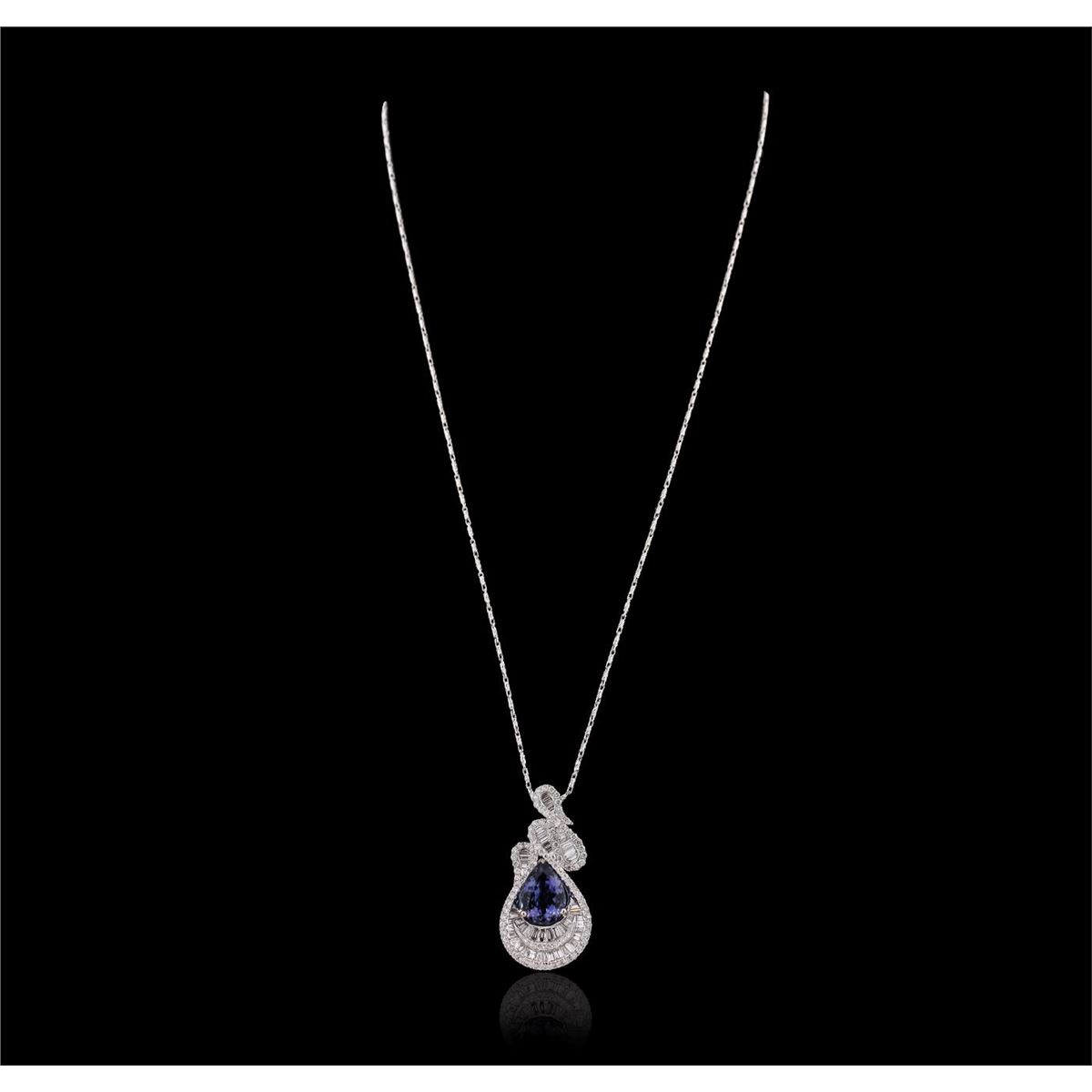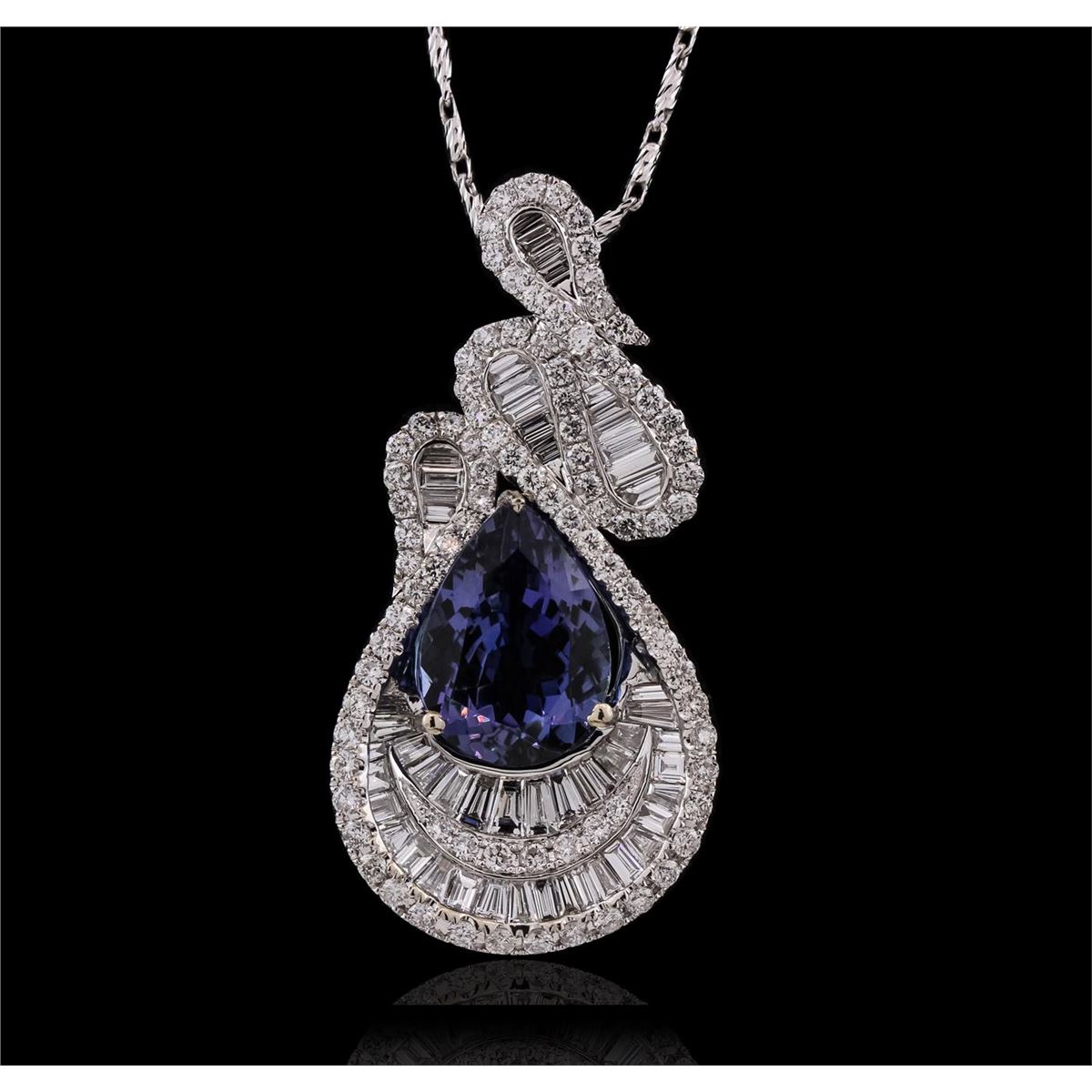 One electronically tested 18KT White Gold ladies cast & assembled tanzanite and diamond pendant with chain. The pendant features a tanzanite set within intertwining diamond ribbons, completed by a diamond set hidden bail. The pendant is supported by an eighteen inch length 14KT White Gold designer style chain, terminating in a lobster claw clasp. Bright polish finish with milgrain detailing. Identified with markings of "18K 750". Condition is new, good workmanship. Containing: One prong set pear brilliant cut natural tanzanite, measuring 12.00 x 9.20 x 5.80mm, 8% bulge factor, approximate weight of 4.63ct., clarity is eye clean, type I, medium dark, slightly grayish, bluish violet color, (GIA bV 6/2), cut is good. Transmitting light with no distortion, transparent. Graded in the setting. Tanzanite is a very rare gemstone that is only found in the country of Tanzania. Originally discovered in 1967. Tiffany & Company, named the stone Tanzanite. It is found in the Usumburu Mountains that border the Umba Valley of northern Tanzania. Tanzanite occurs in gray, brown, violet, blue, reddish-purple, & green. The gem is interesting because of its exceptional pleochroism. Rotated in different directions a tanzanite will exhibit multiple changes of color. Tanzanite has a low tolerance to ultrasonic cleaning, and should not be cleaned using this method. One Hundred Forty-Seven prong and channel set round brilliant & baguette cut diamonds approximate total weight of 147 Stones = 2.38ct. Graded in the setting. Clarity: VS-1 to SI-1. Color: G - I. Total Weight of Colored Stones 4.63ct. Total Weight of Diamonds 2.38ct. Total Weight of Pendant With Chain 10.88 grams. AIG Appraised at $19,685.00.