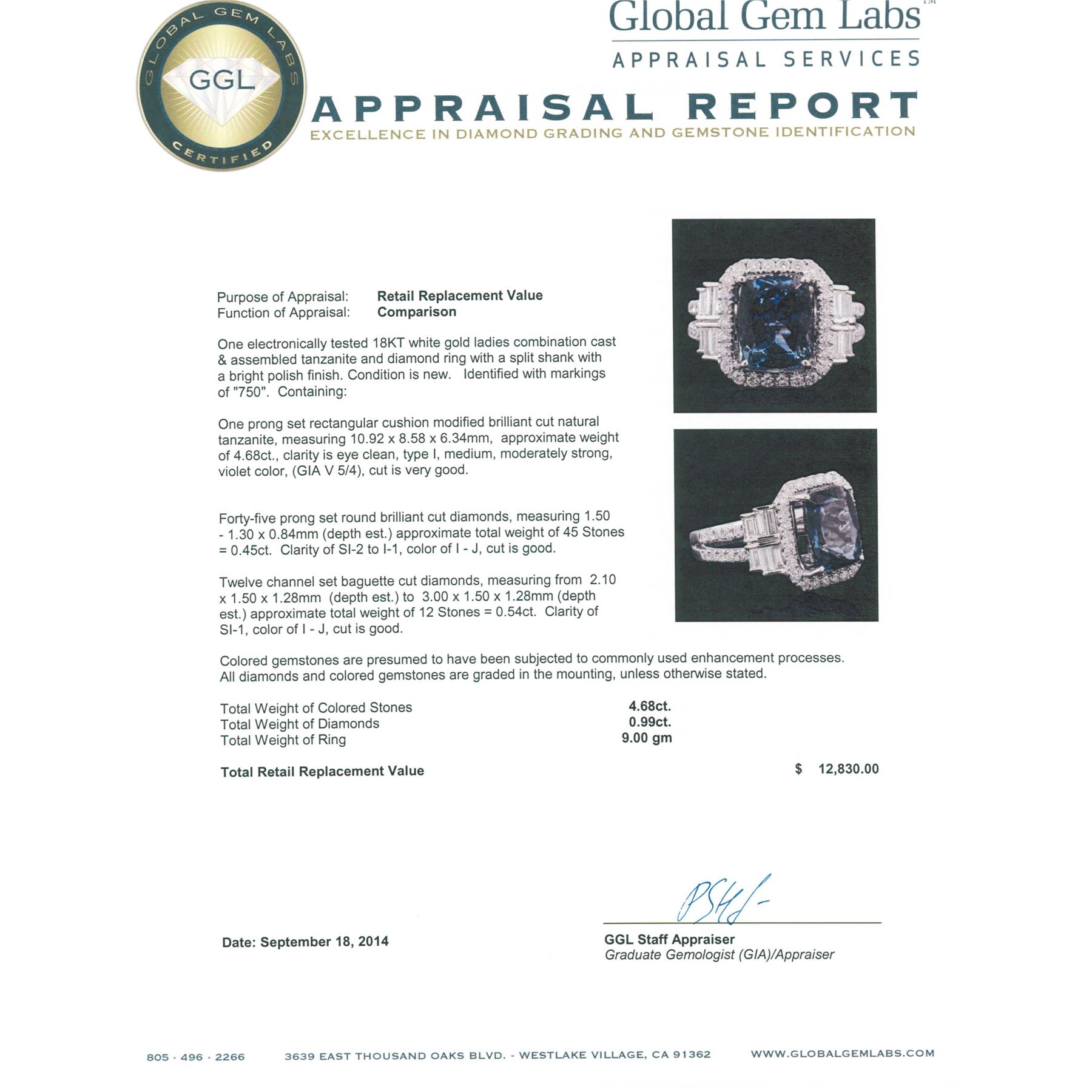 One electronically tested 18KT white gold ladies combination cast & assembled tanzanite and diamond ring with a split shank with a bright polish finish. Identified with markings of "750". Condition is new. Containing: One prong set rectangular cushion modified brilliant cut natural tanzanite, measuring 10.92 x 8.58 x 6.34mm, approximate weight of 4.68ct., clarity is eye clean, type I, medium, moderately strong, violet color, (GIA V 5/4), cut is very good. Forty-Five prong set round brilliant cut diamonds, measuring 1.50 - 1.30 x 0.84mm (depth est.) approximate total weight of 45 Stones = 0.45ct. Clarity: SI-2 to I-1. Color: I - J, Cut is Good. Twelve channel set baguette cut diamonds, measuring from 2.10 x 1.50 x 1.28mm (depth est.) to 3.00 x 1.50 x 1.28mm (depth est.) approximate total weight of 12 Stones = 0.54ct. Clarity: SI-1. Color: I - J, Cut is Good. Colored gemstones are presumed to have been subjected to commonly used enhancement processes. All diamonds and colored gemstones are graded in the mounting, unless otherwise stated. Total Weight of Colored Stones 4.68ct. Total Weight of Diamonds 0.99ct. Total Weight of Ring 9.00 grams. GGL Appraised at $12,830.00.