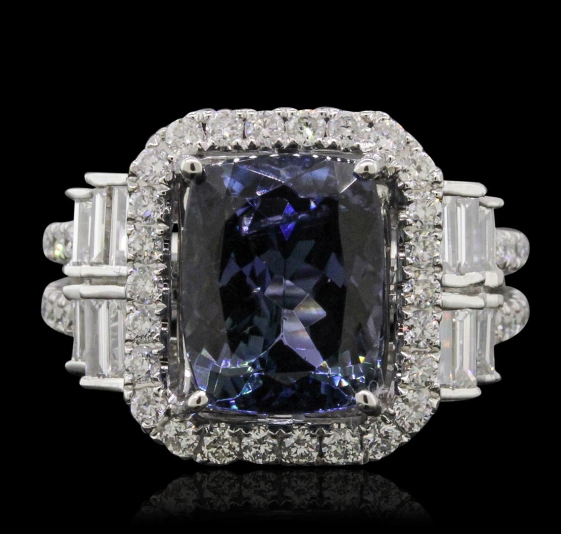 One electronically tested 18KT white gold ladies combination cast & assembled tanzanite and diamond ring with a split shank with a bright polish finish. Identified with markings of "750". Condition is new. Containing: One prong set rectangular cushion modified brilliant cut natural tanzanite, measuring 10.92 x 8.58 x 6.34mm, approximate weight of 4.68ct., clarity is eye clean, type I, medium, moderately strong, violet color, (GIA V 5/4), cut is very good. Forty-Five prong set round brilliant cut diamonds, measuring 1.50 - 1.30 x 0.84mm (depth est.) approximate total weight of 45 Stones = 0.45ct. Clarity: SI-2 to I-1. Color: I - J, Cut is Good. Twelve channel set baguette cut diamonds, measuring from 2.10 x 1.50 x 1.28mm (depth est.) to 3.00 x 1.50 x 1.28mm (depth est.) approximate total weight of 12 Stones = 0.54ct. Clarity: SI-1. Color: I - J, Cut is Good. Colored gemstones are presumed to have been subjected to commonly used enhancement processes. All diamonds and colored gemstones are graded in the mounting, unless otherwise stated. Total Weight of Colored Stones 4.68ct. Total Weight of Diamonds 0.99ct. Total Weight of Ring 9.00 grams. GGL Appraised at $12,830.00.