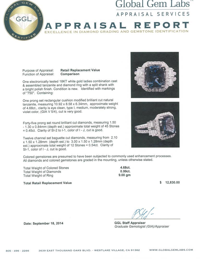 One electronically tested 18KT white gold ladies combination cast & assembled tanzanite and diamond ring with a split shank with a bright polish finish. Identified with markings of "750". Condition is new. Containing: One prong set rectangular cushion modified brilliant cut natural tanzanite, measuring 10.92 x 8.58 x 6.34mm, approximate weight of 4.68ct., clarity is eye clean, type I, medium, moderately strong, violet color, (GIA V 5/4), cut is very good. Forty-Five prong set round brilliant cut diamonds, measuring 1.50 - 1.30 x 0.84mm (depth est.) approximate total weight of 45 Stones = 0.45ct. Clarity: SI-2 to I-1. Color: I - J, Cut is Good. Twelve channel set baguette cut diamonds, measuring from 2.10 x 1.50 x 1.28mm (depth est.) to 3.00 x 1.50 x 1.28mm (depth est.) approximate total weight of 12 Stones = 0.54ct. Clarity: SI-1. Color: I - J, Cut is Good. Colored gemstones are presumed to have been subjected to commonly used enhancement processes. All diamonds and colored gemstones are graded in the mounting, unless otherwise stated. Total Weight of Colored Stones 4.68ct. Total Weight of Diamonds 0.99ct. Total Weight of Ring 9.00 grams. GGL Appraised.
