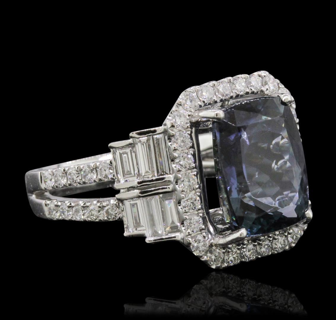 One electronically tested 18KT white gold ladies combination cast & assembled tanzanite and diamond ring with a split shank with a bright polish finish. Identified with markings of "750". Condition is new. Containing: One prong set rectangular cushion modified brilliant cut natural tanzanite, measuring 10.92 x 8.58 x 6.34mm, approximate weight of 4.68ct., clarity is eye clean, type I, medium, moderately strong, violet color, (GIA V 5/4), cut is very good. Forty-Five prong set round brilliant cut diamonds, measuring 1.50 - 1.30 x 0.84mm (depth est.) approximate total weight of 45 Stones = 0.45ct. Clarity: SI-2 to I-1. Color: I - J, Cut is Good. Twelve channel set baguette cut diamonds, measuring from 2.10 x 1.50 x 1.28mm (depth est.) to 3.00 x 1.50 x 1.28mm (depth est.) approximate total weight of 12 Stones = 0.54ct. Clarity: SI-1. Color: I - J, Cut is Good. Colored gemstones are presumed to have been subjected to commonly used enhancement processes. All diamonds and colored gemstones are graded in the mounting, unless otherwise stated. Total Weight of Colored Stones 4.68ct. Total Weight of Diamonds 0.99ct. Total Weight of Ring 9.00 grams. GGL Appraised.