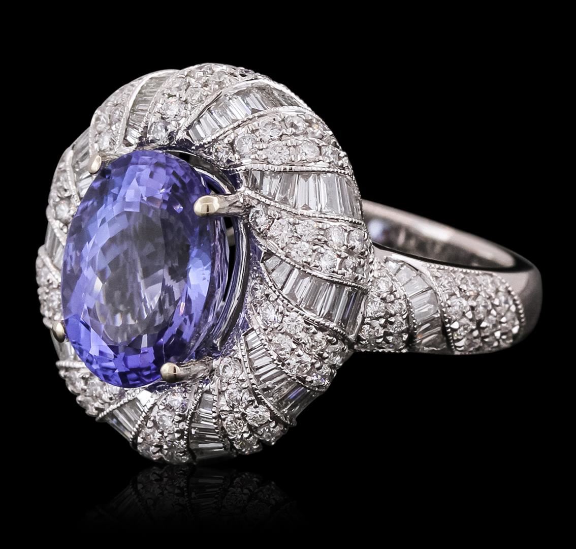 One electronically tested 18KT white gold ladies combination cast & assembled prong set ring with a bright polish finish. Identified with markings of "750". Condition is new. Containing: One prong set oval modified brilliant cut natural tanzanite, measuring 11.66 x 8.95 x 6.83mm, approximate weight of 4.86ct., clarity is eye clean, type I, medium light, very slightly grayish, violet color, (GIA V 4/3), cut is good. One Hundred Sixty-Six prong set round brilliant cut diamonds, measuring 1.30 - 1.10 x 0.72mm (depth est.) approximate total weight of 166 Stones = 1.05ct. Clarity: SI-2 to I-1. Color: H - I, Cut is Good. All diamonds are graded in the mounting, unless otherwise stated, Colored gemstones are presumed to have been subjected to commonly used enhancement processes. One Hundred Ten channel set baguette cut diamonds, measuring from 1.10 x 1.10 x 0.94mm (depth est.) to 2.00 x 1.50 x 1.28mm (depth est.) approximate total weight of 110 Stones = 2.24ct. Clarity: SI-1. Color: G - H, Cut is Good. Colored gemstones are presumed to have been subjected to commonly used enhancement processes. All diamonds and colored gemstones are graded in the mounting, unless otherwise stated. Total Weight of Colored Stones 4.86ct. Total Weight of Diamonds 3.29ct. Total Weight of Ring 11.50 grams. GGL Appraised at $20,495.00.