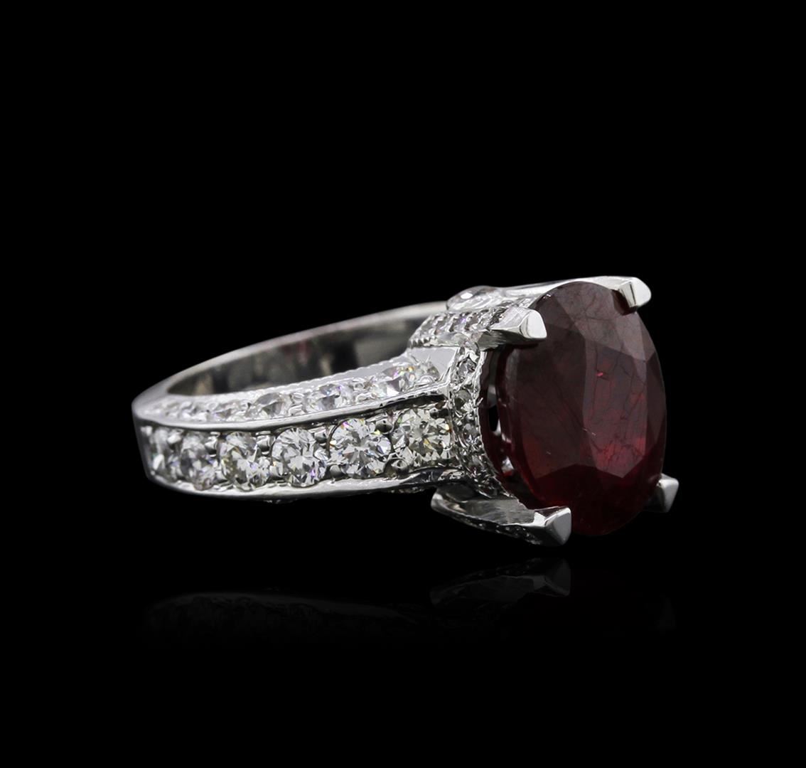 One electronically tested 18KT white gold ladies cast ruby and diamond ring with a bright polish finish. Identified with markings of "18K". Condition is new. Containing: One prong set oval modified brilliant cut natural ruby, measuring 11.00 x 9.00 x 5.86mm, approximate weight of 4.87ct., clarity is heavily included, type II, medium dark, moderately strong, strongly purplish red color, (GIA stpR 6/4), cut is good. Seventy-Two prong set round brilliant cut diamonds, measuring 2.50 - 1.30 x 1.14mm (depth est.) approximate. Total Weight of 72 Stones = 1.81ct. Clarity: SI-1 to SI-2. Color: I - J, Cut is Good. Colored gemstones are presumed to have been subjected to commonly used enhancement processes. All diamonds and colored gemstones are graded in the mounting, unless otherwise stated. Total Weight of Colored Stones 4.87ct. Total Weight of Diamonds 1.81ct. Total Weight of Ring 8.30 grams. GGL Appraised at $6,020.00.