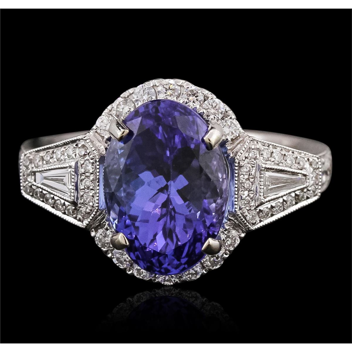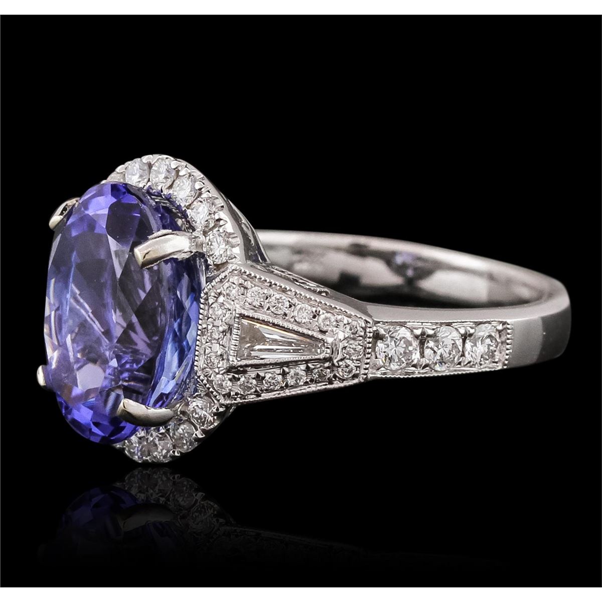 One electronically tested 18KT white gold ladies combination cast & assembled prong set ring with a split shoulder shank with a bright polish finish. Identified with markings of "750". Condition is new. Containing: One prong set oval modified brilliant cut natural tanzanite, measuring 11.82 x 8.33 x 7.42mm, approximate weight of 5.05ct., clarity is eye clean, type I, medium, moderately strong, bluish violet color, (GIA bV 5/4), cut is good. Fifty-Two prong set round brilliant cut diamonds, measuring 1.80 - 1.00 x 0.84mm (depth est.) approximate total weight of 52 Stones = 0.53ct. Clarity: SI-1 to I-1. Color: H - I, Cut is Good. Two bezel set baguette cut (tapered) diamonds, measuring 4.00 x 1.50 x 1.28mm (depth est.) approximate total weight of 2 Stones = 0.16ct. Clarity: SI-1. Color: H, Cut is Good. All diamonds are graded in the mounting, unless otherwise stated. Colored gemstones are presumed to have been subjected to commonly used enhancement processes. Total Weight of Colored Stones 5.05ct. Total Weight of Diamonds 0.69ct. Total Weight of Ring 7.20 grams. GGL Appraised at $11,915.00.