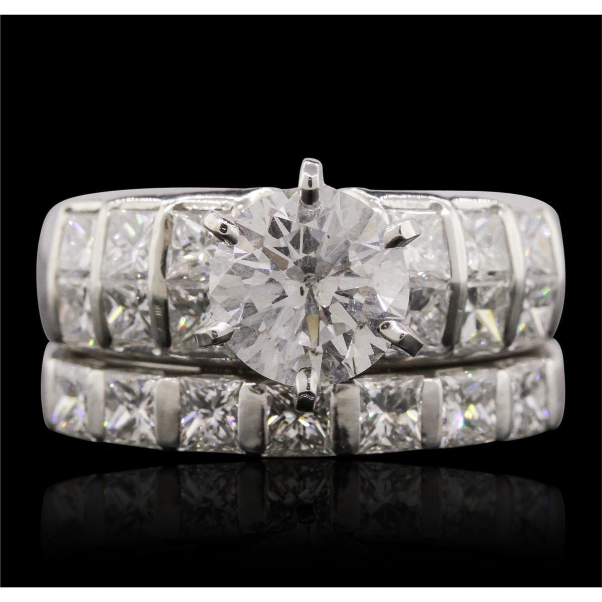 One electronically tested 18KT white gold Ladies combination cast & assembled engagement ring & wedding band with a bright polish finish. Condition is new. Engagement ring and wedding band soldered together. Containing: One prong set round brilliant cut diamond, measuring 8.00 - 8.00 x 5.20mm (depth est.) approximate weight of 2.03ct. Clarity: I-2. Color: G, Cut is Good. Nineteen prong set princess cut diamonds, measuring 3.00 x 3.00 x 2.26mm (depth est.) approximate. Total Weight of 19 Stones = 3.17ct. Clarity: VS-2 to SI-1. Color: I - J, Cut is Good. Total Weight of Diamonds 5.20ct. Total Weight of 16.60 grams. GGL Appraised at $38,585.00.