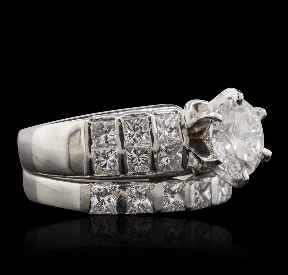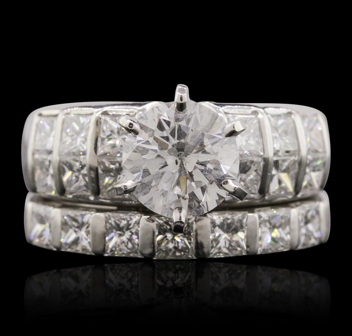 One electronically tested 18KT white gold Ladies combination cast & assembled engagement ring & wedding band with a bright polish finish. Condition is new. Engagement ring and wedding band soldered together. Containing: One prong set round brilliant cut diamond, measuring 8.00 - 8.00 x 5.20mm (depth est.) approximate weight of 2.03ct. Clarity: I-2. Color: G, Cut is Good. Nineteen prong set princess cut diamonds, measuring 3.00 x 3.00 x 2.26mm (depth est.) approximate. Total Weight of 19 Stones = 3.17ct. Clarity: VS-2 to SI-1. Color: I - J, Cut is Good. Total Weight of Diamonds 5.20ct. Total Weight of 16.60 grams. GGL Appraised at $38,585.00.