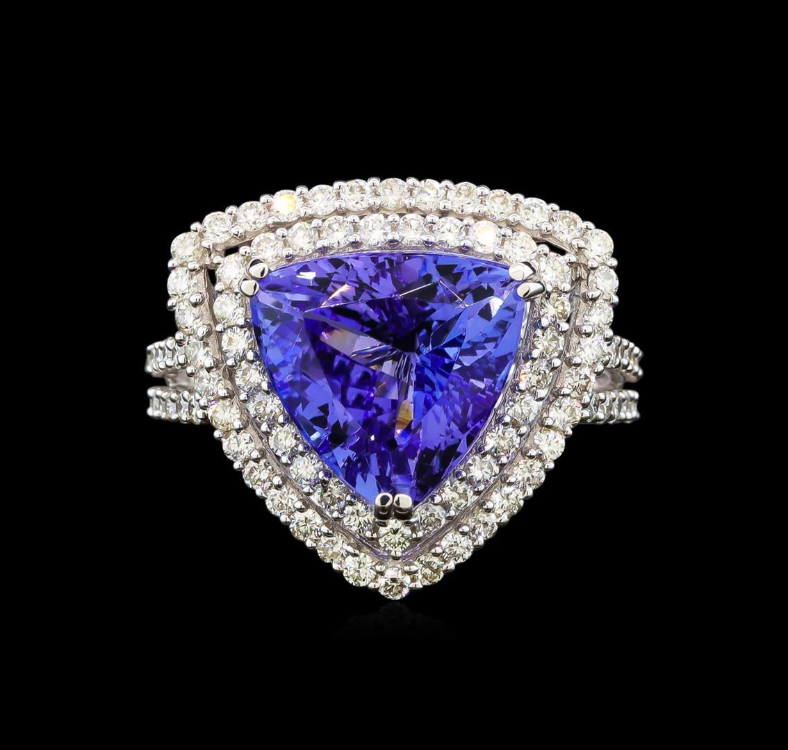 One electronically tested 18KT white gold ladies cast tanzanite and diamond ring with a bright polish finish. Identified with markings of "18K". Condition is new. Containing: One prong set triangle modified brilliant cut natural tanzanite, measuring 11.00 x 11.00 x 7.15mm, approximate weight of 5.22ct., clarity is eye clean, type I, medium light, very slightly grayish, violet color, (GIA V 4/3), cut is good. Eighty-Seven prong set round brilliant cut diamonds, measuring 1.50 - 1.50 x 0.90mm (depth est.) approximate total weight of 87 Stones = 1.07ct. Clarity: SI-1 to I-1. Color: I - J, Cut is Good. Colored gemstones are presumed to have been subjected to commonly used enhancement processes. All diamonds and colored gemstones are graded in the mounting, unless otherwise stated. Total Weight of Colored Stones 5.22ct. Total Weight of Diamonds 1.07ct. Total Weight of Ring 6.60 grams. GGL Appraised at $7,700.00.