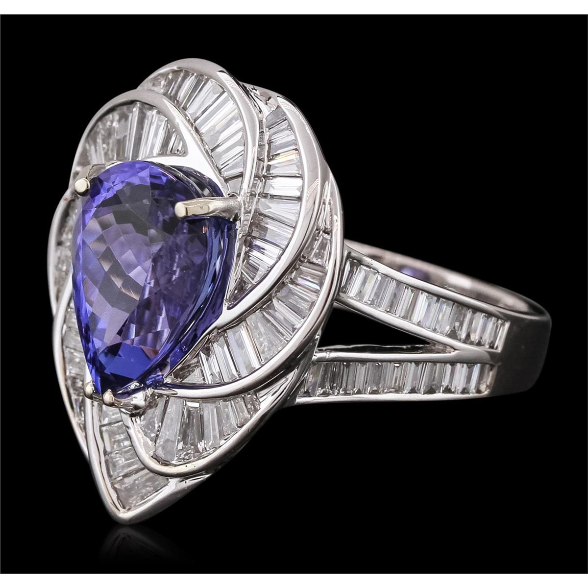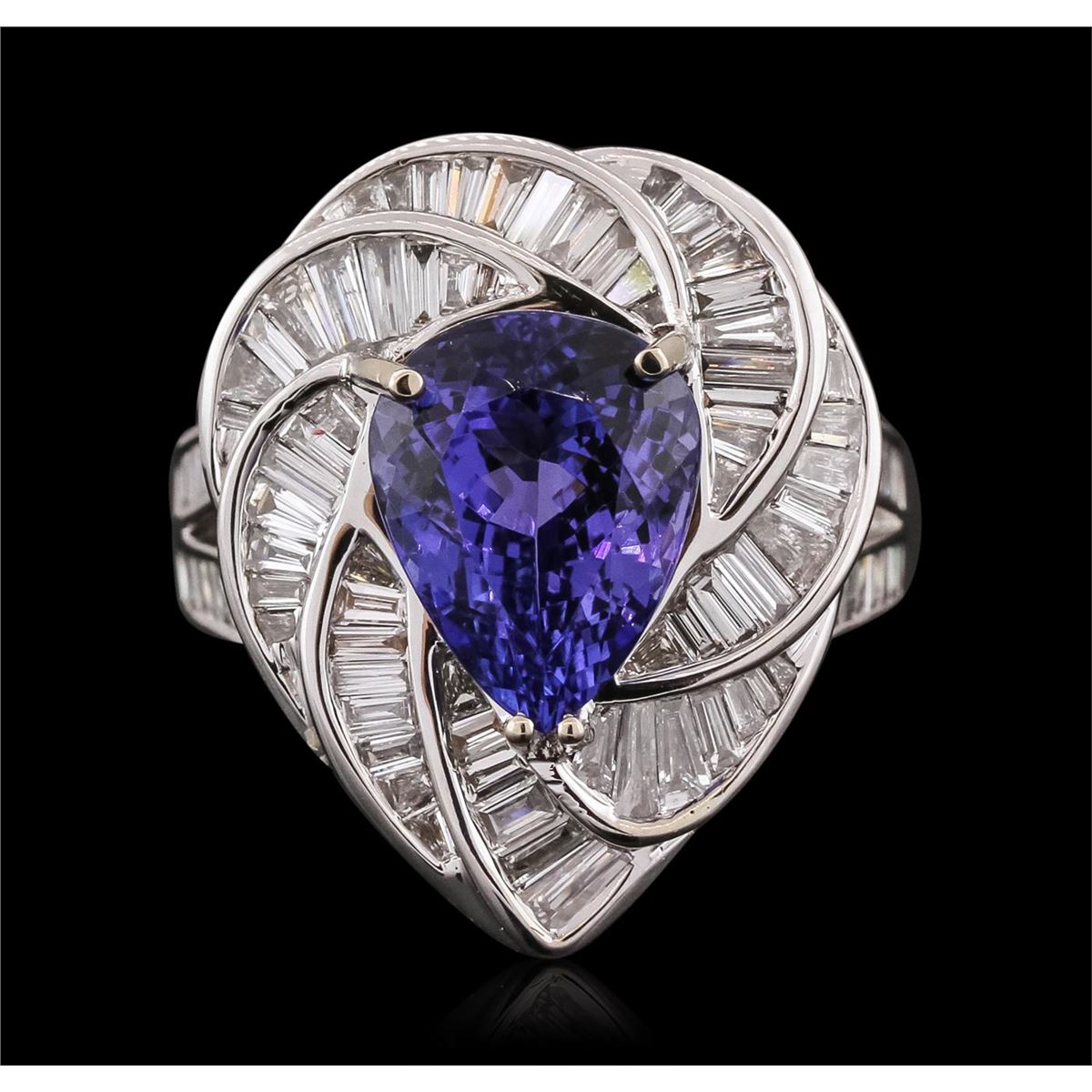 One electronically tested 18KT white gold ladies combination cast & assembled prong set ring with a split shank with a bright polish finish. Identified with markings of "750". Condition is new. Containing: One prong set pear modified brilliant cut natural tanzanite, measuring 11.85 x 9.70 x 6.96mm, approximate weight of 5.36ct., clarity is eye clean, type I, medium light, moderately strong, violet color, (GIA V 4/4), cut is good. One Hundred Nine channel set baguette cut diamonds, measuring from 1.10 x 1.10 x 0.94mm (depth est.) to 2.60 x 1.50 x 1.28mm (depth est.) approximate total weight of 109 Stones = 2.01ct. Clarity: VS-2 to SI-1. Color: H - I, Cut is Good. All diamonds are graded in the mounting, unless otherwise stated, Colored gemstones are presumed to have been subjected to commonly used enhancement processes. Total Weight of Colored Stones 5.36ct. Total Weight of Diamonds 2.01ct. Total Weight of Ring 12.10 grams. GGL Appraised at $18,225.00.
