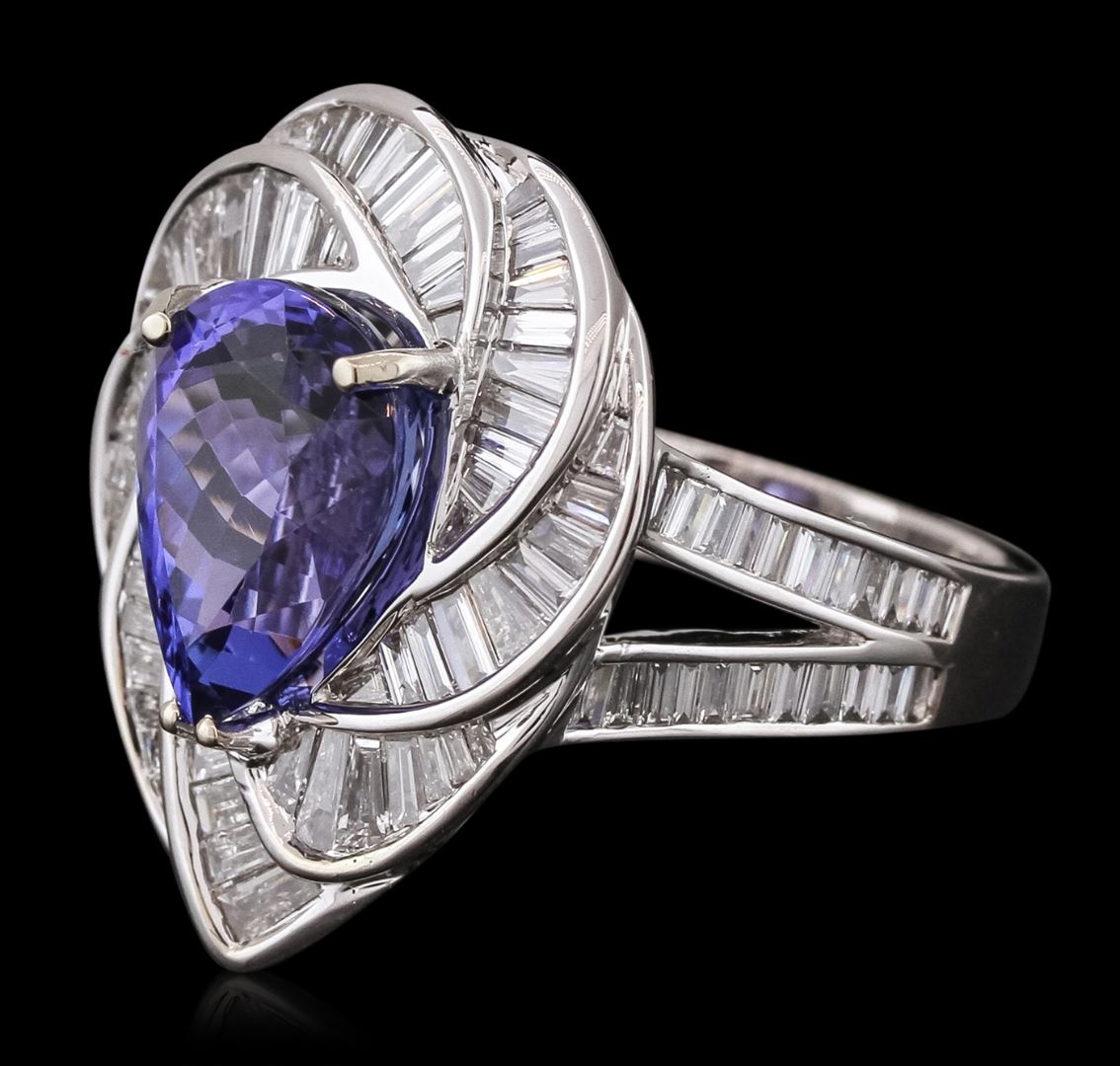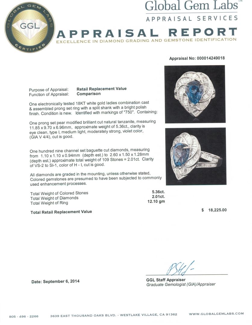 One electronically tested 18KT white gold ladies combination cast & assembled prong set ring with a split shank with a bright polish finish. Identified with markings of "750". Condition is new. Containing: One prong set pear modified brilliant cut natural tanzanite, measuring 11.85 x 9.70 x 6.96mm, approximate weight of 5.36ct., clarity is eye clean, type I, medium light, moderately strong, violet color, (GIA V 4/4), cut is good. One Hundred Nine channel set baguette cut diamonds, measuring from 1.10 x 1.10 x 0.94mm (depth est.) to 2.60 x 1.50 x 1.28mm (depth est.) approximate total weight of 109 Stones = 2.01ct. Clarity: VS-2 to SI-1. Color: H - I, Cut is Good. All diamonds are graded in the mounting, unless otherwise stated, Colored gemstones are presumed to have been subjected to commonly used enhancement processes. Total Weight of Colored Stones 5.36ct. Total Weight of Diamonds 2.01ct. Total Weight of Ring 12.10 grams. GGL Appraised at $18,225.00.