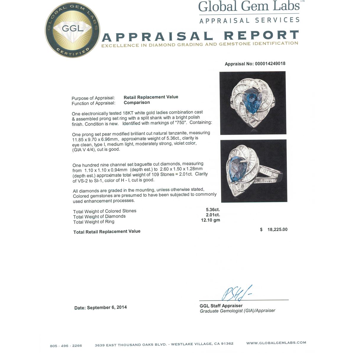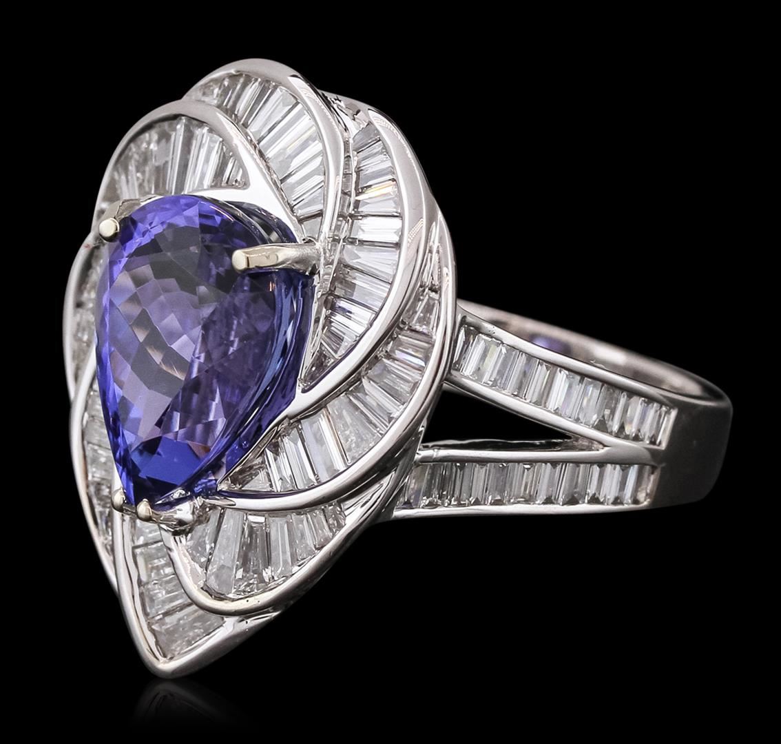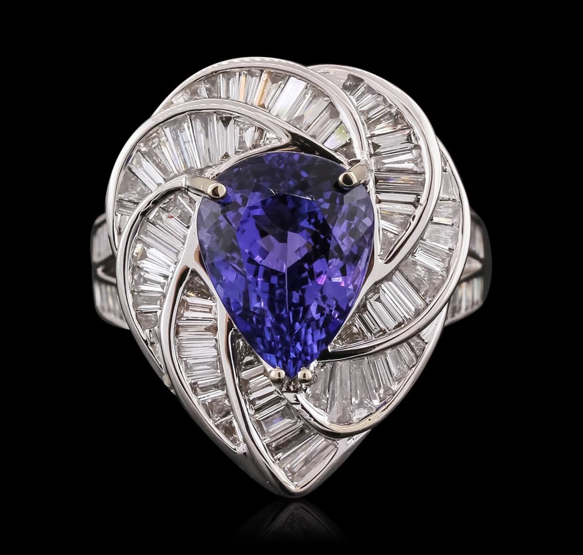 One electronically tested 18KT white gold ladies combination cast & assembled prong set ring with a split shank with a bright polish finish. Identified with markings of "750". Condition is new. Containing: One prong set pear modified brilliant cut natural tanzanite, measuring 11.85 x 9.70 x 6.96mm, approximate weight of 5.36ct., clarity is eye clean, type I, medium light, moderately strong, violet color, (GIA V 4/4), cut is good. One Hundred Nine channel set baguette cut diamonds, measuring from 1.10 x 1.10 x 0.94mm (depth est.) to 2.60 x 1.50 x 1.28mm (depth est.) approximate total weight of 109 Stones = 2.01ct. Clarity: VS-2 to SI-1. Color: H - I, Cut is Good. All diamonds are graded in the mounting, unless otherwise stated, Colored gemstones are presumed to have been subjected to commonly used enhancement processes. Total Weight of Colored Stones 5.36ct. Total Weight of Diamonds 2.01ct. Total Weight of Ring 12.10 grams. GGL Appraised at $18,225.00.