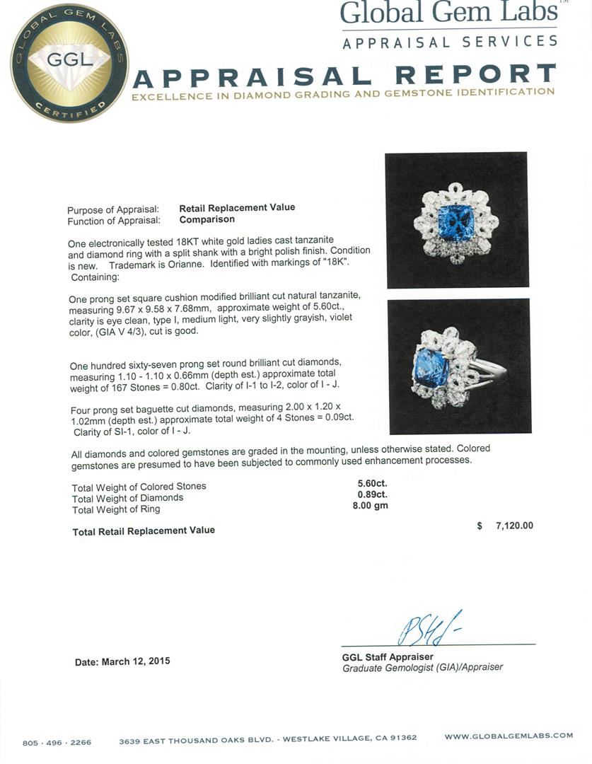 One electronically tested 18KT white gold ladies cast tanzanite and diamond ring with a split shank with a bright polish finish. Trademark is Orianne. Identified with markings of "18K". Condition is new. Containing: One prong set square cushion modified brilliant cut natural tanzanite, measuring 9.67 x 9.58 x 7.68mm, approximate weight of 5.60ct., clarity is eye clean, type I, medium light, very slightly grayish, violet color, (GIA V 4/3), cut is good. One Hundred Sixty-Seven prong set round brilliant cut diamonds, measuring 1.10 - 1.10 x 0.66mm (depth est.) approximate total weight of 167 Stones = 0.80ct. Clarity: I-1 to I-2. Color: I - J. Four prong set baguette cut diamonds, measuring 2.00 x 1.20 x 1.02mm (depth est.) approximate total weight of 4 Stones = 0.09ct. Clarity: SI-1. Color: I - J. All diamonds and colored gemstones are graded in the mounting, unless otherwise stated. Colored gemstones are presumed to have been subjected to commonly used enhancement processes. Total Weight of Colored Stones 5.60ct. Total Weight of Diamonds 0.89ct. Total Weight of Ring 8.00 grams. GGL Appraised at $7,120.00.