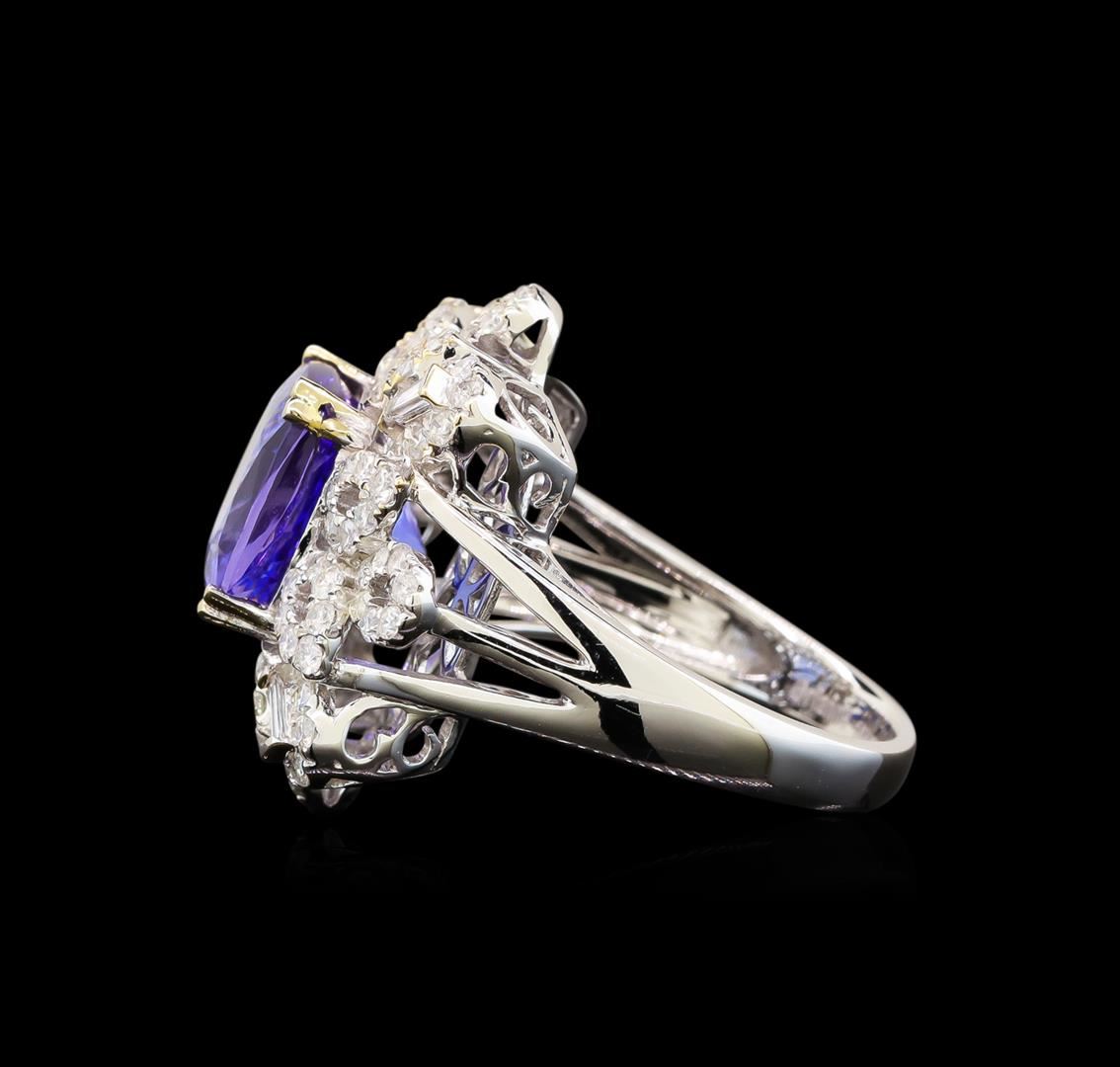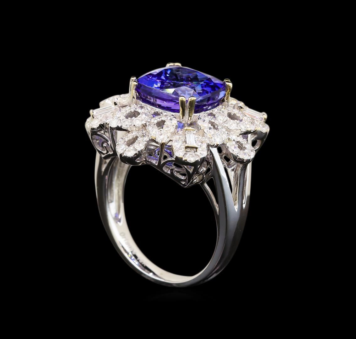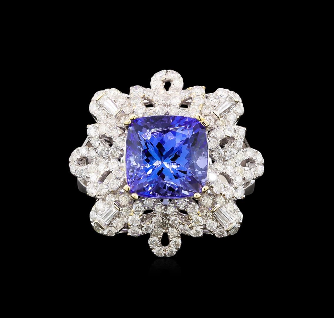 One electronically tested 18KT white gold ladies cast tanzanite and diamond ring with a split shank with a bright polish finish. Trademark is Orianne. Identified with markings of "18K". Condition is new. Containing: One prong set square cushion modified brilliant cut natural tanzanite, measuring 9.67 x 9.58 x 7.68mm, approximate weight of 5.60ct., clarity is eye clean, type I, medium light, very slightly grayish, violet color, (GIA V 4/3), cut is good. One Hundred Sixty-Seven prong set round brilliant cut diamonds, measuring 1.10 - 1.10 x 0.66mm (depth est.) approximate total weight of 167 Stones = 0.80ct. Clarity: I-1 to I-2. Color: I - J. Four prong set baguette cut diamonds, measuring 2.00 x 1.20 x 1.02mm (depth est.) approximate total weight of 4 Stones = 0.09ct. Clarity: SI-1. Color: I - J. All diamonds and colored gemstones are graded in the mounting, unless otherwise stated. Colored gemstones are presumed to have been subjected to commonly used enhancement processes. Total Weight of Colored Stones 5.60ct. Total Weight of Diamonds 0.89ct. Total Weight of Ring 8.00 grams. GGL Appraised at $7,120.00.