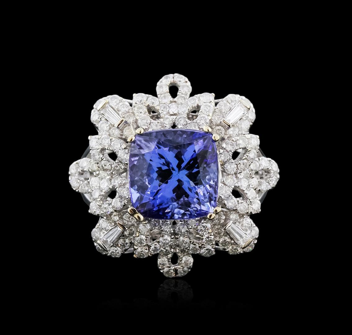 One electronically tested 18KT white gold ladies cast tanzanite and diamond ring with a split shank with a bright polish finish. Trademark is Orianne. Identified with markings of "18K". Condition is new. Containing: One prong set square cushion modified brilliant cut natural tanzanite, measuring 9.67 x 9.58 x 7.68mm, approximate weight of 5.60ct., clarity is eye clean, type I, medium light, very slightly grayish, violet color, (GIA V 4/3), cut is good. One Hundred Sixty-Seven prong set round brilliant cut diamonds, measuring 1.10 - 1.10 x 0.66mm (depth est.) approximate total weight of 167 Stones = 0.80ct. Clarity: I-1 to I-2. Color: I - J. Four prong set baguette cut diamonds, measuring 2.00 x 1.20 x 1.02mm (depth est.) approximate total weight of 4 Stones = 0.09ct. Clarity: SI-1. Color: I - J. All diamonds and colored gemstones are graded in the mounting, unless otherwise stated. Colored gemstones are presumed to have been subjected to commonly used enhancement processes. Total Weight of Colored Stones 5.60ct. Total Weight of Diamonds 0.89ct. Total Weight of Ring 8.00 grams. GGL Appraised at $7,120.00.