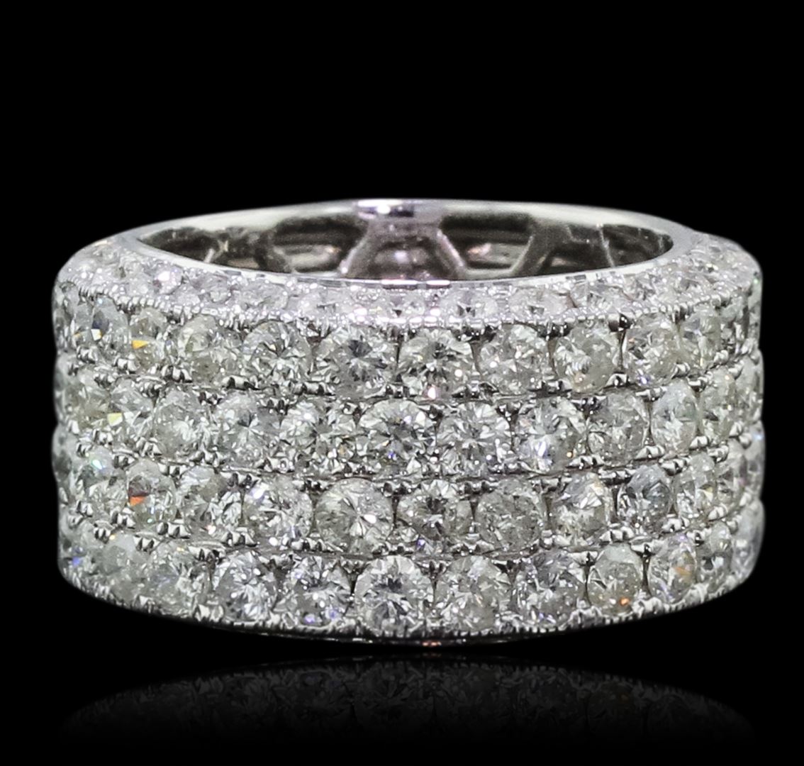 One electronically tested 18KT white gold ladies cast diamond ring. Condition is new, good workmanship. The ring features an elaborated twelve and one-half millimeter wide diamond set curvature, completed by a twelve millimeter wide band. Bright polish finish with milgrain detailing. Identified with markings of "18K". Containing: Sixty-Six pav, set round brilliant cut diamonds, measuring 2.70 - 2.50 x 1.56mm (depth est.) approximate. Total Weight of 66 Stones = 4.35ct. The color grade reflects the entire range of color for this group. Graded in the setting. Clarity: SI-2 to I-2. Color: H - K Thirty-Six pav, set round brilliant cut diamonds, measuring 2.10 - 2.00 x 1.23mm (depth est.) approximate. Total Weight of 36 Stones = 1.23ct. The color grade reflects the entire range of color for this group. Graded in the setting. Clarity: SI-1 to I-1. Color: H - K Eight pav, set round brilliant cut diamonds, measuring 1.20 - 1.10 x 0.69mm (depth est.) approximate. Total Weight of 8 Stones = 0.05ct. Graded in the setting. Clarity: SI-1 to SI-2. Color: G - I. Total Weight of Diamonds 5.63ct. Total Weight of Ring 12.13 grams. AIG Appraised at $15,530.00.
