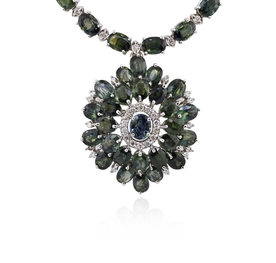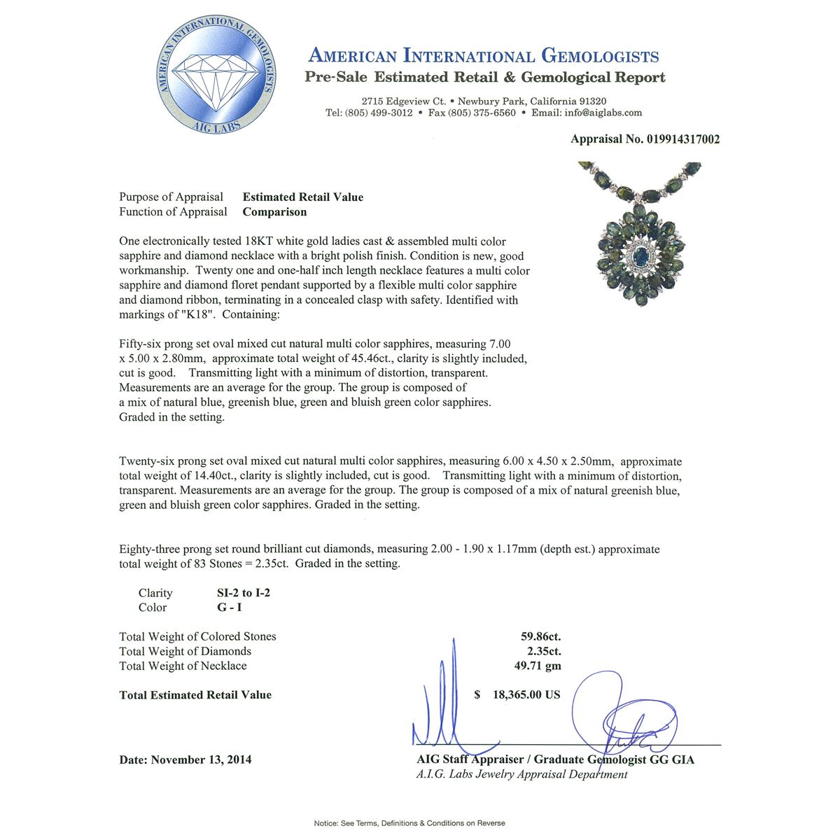 One electronically tested 18KT white gold ladies cast & assembled multi color sapphire and diamond necklace with a bright polish finish. Twenty one and one-half inch length necklace features a multi color sapphire and diamond floret pendant supported by a flexible multi color sapphire and diamond ribbon, terminating in a concealed clasp with safety. Identified with markings of "K18". Condition is new, good workmanship. Containing: Fifty-six prong set oval mixed cut natural multi color sapphires, measuring 7.00 x 5.00 x 2.80mm, approximate total weight of 45.46ct., clarity is slightly included, cut is good. Transmitting light with a minimum of distortion, transparent. Measurements are an average for the group. The group is composed of a mix of natural blue, greenish blue, green and bluish green color sapphires. Graded in the setting. Twenty-six prong set oval mixed cut natural multi color sapphires, measuring 6.00 x 4.50 x 2.50mm, approximate total weight of 14.40ct., clarity is slightly included, cut is good. Transmitting light with a minimum of distortion, transparent. Measurements are an average for the group. The group is composed of a mix of natural greenish blue, green and bluish green color sapphires. Graded in the setting. Eighty-Three prong set round brilliant cut diamonds, measuring 2.00 - 1.90 x 1.17mm (depth est.) approximate total weight of 83 Stones = 2.35ct. Graded in the setting. Clarity: SI-2 to I-2. Color: G - I. Total Weight of Colored Stones 59.86ct. Total Weight of Diamonds 2.35ct. Total Weight of Necklace 49.71 grams. AIG Appraised at $18,365.00.