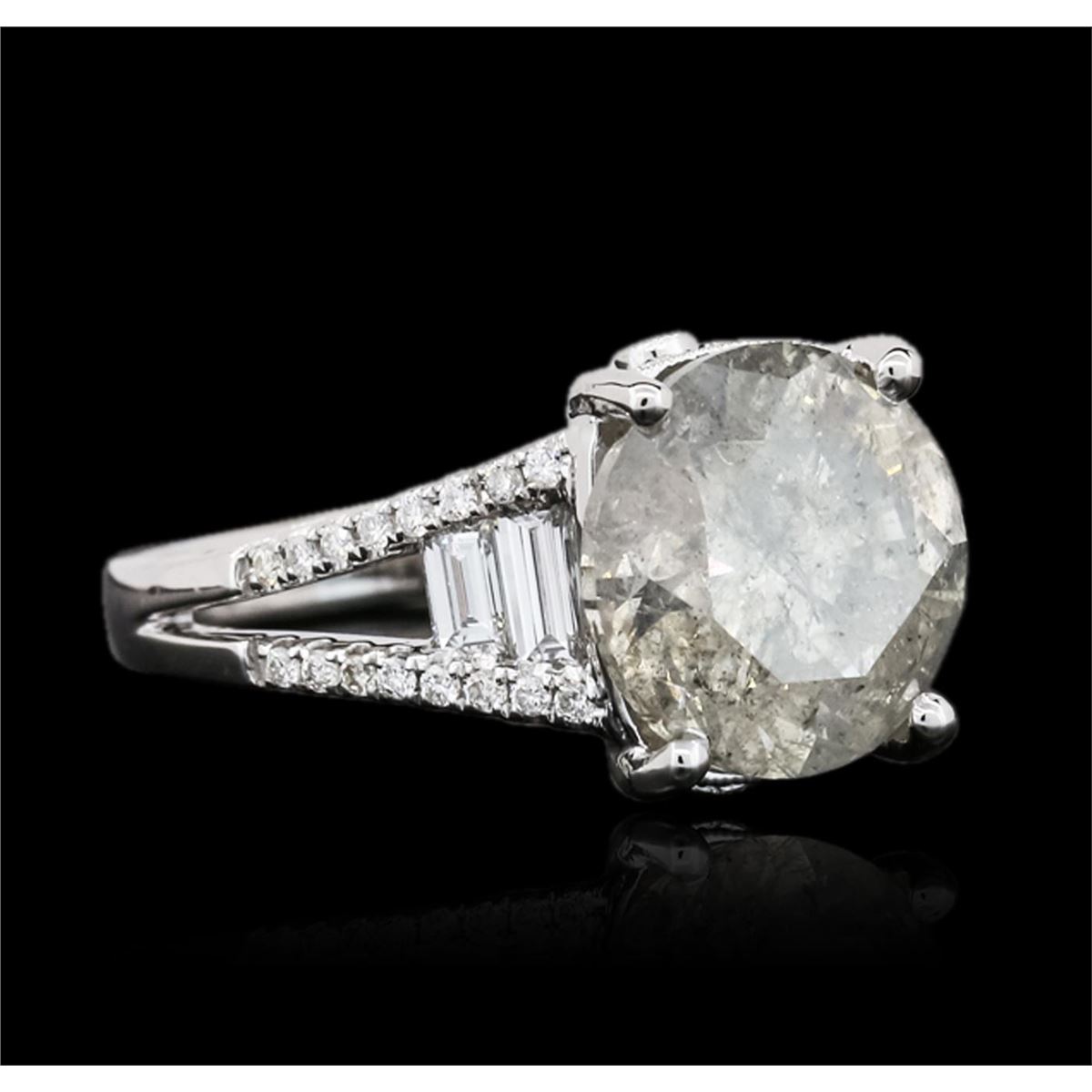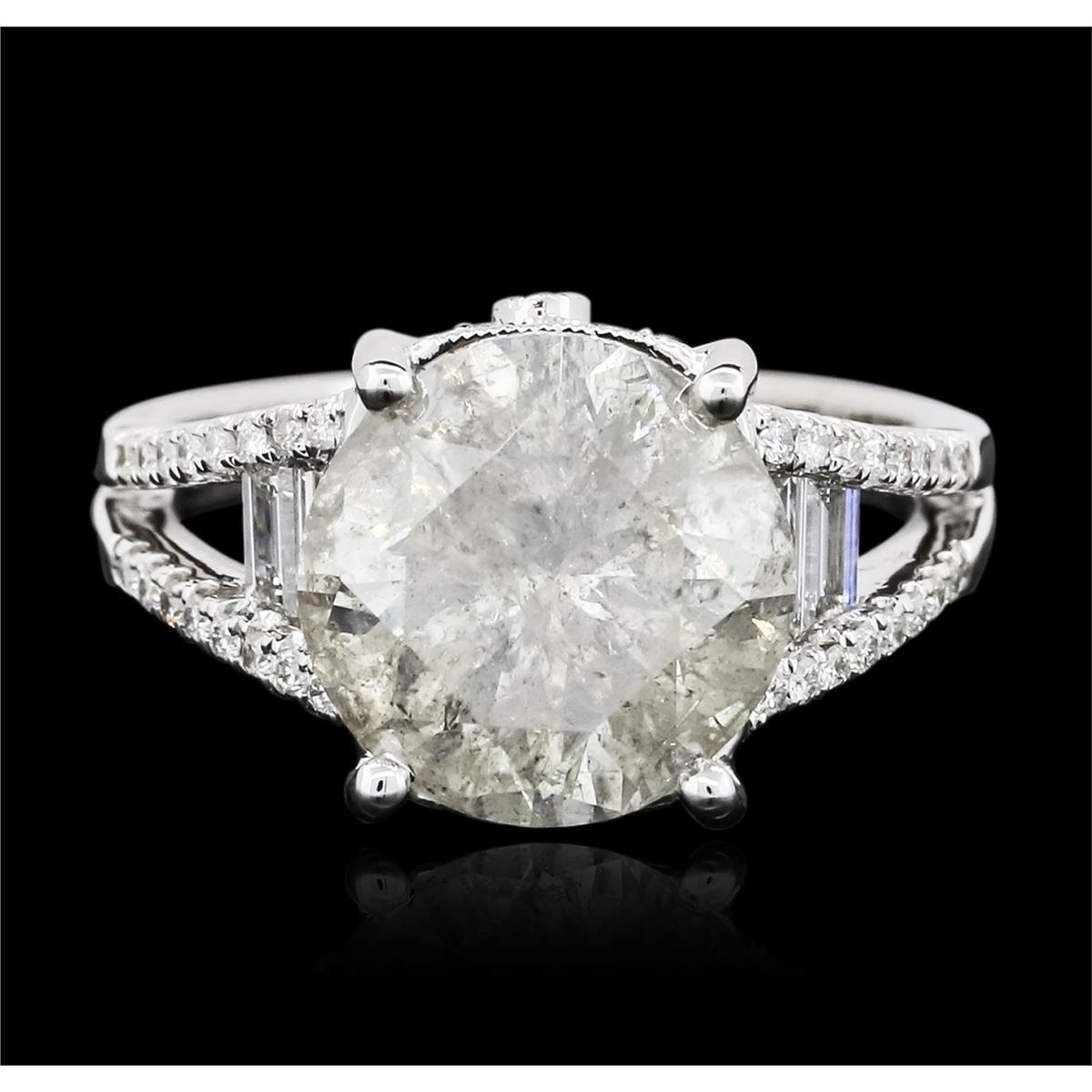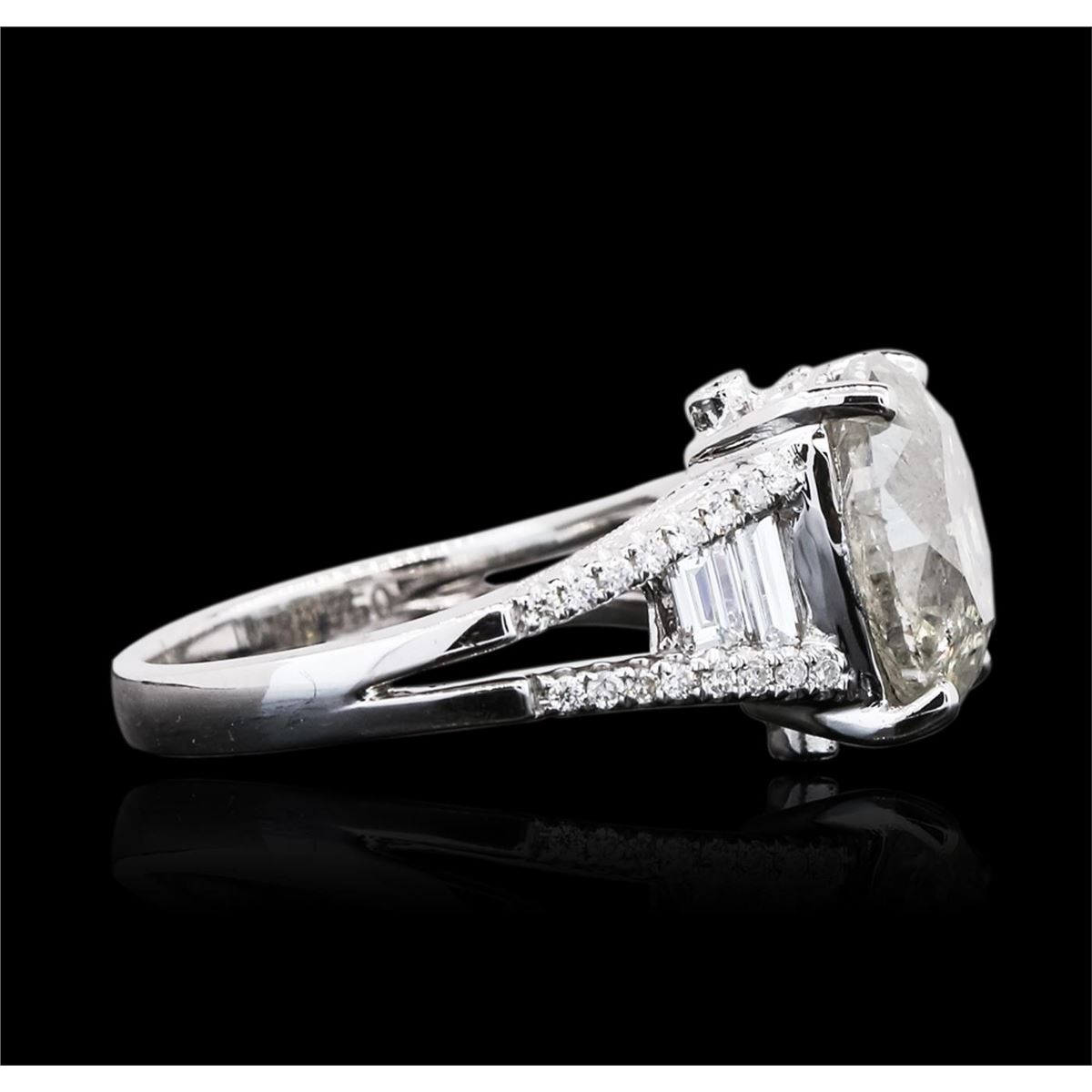 One electronically tested 18KT white gold ladies cast diamond unity ring with a bright polish finish. The featured diamond is supported by diamond set split shoulders, completed by a two and one-half millimeter wide band. Identified with markings of "18K 750". Condition is new, good workmanship. Containing: One prong set round brilliant cut diamond, measuring 11.00 - 10.90 x 7.10mm (depth est.), 4.00.%. GTCF approximate weight of 5.40ct, clarity enhanced. Fracture filling has no tolerance to ultrasonic and steam cleaning. Graded in the setting. Clarity: I-2. Color: 64.8%. Table 59.7%. Forty prong and bezel set round brilliant cut diamonds, measuring 1.20 - 1.10 x 0.69mm (depth est.) approximate total weight of 40 Stones = 0.32ct. Graded in the setting. Clarity: VS-2 to SI-2. Color: G - I Four channel set baguette cut diamonds, measuring from 3.50 x 1.90 x 1.33mm (depth est.) to 4.20 x 1.70 x 1.19mm (depth est.) approximate total weight of 4 Stones = 0.35ct. Graded in the setting. Clarity: VVS-1 to VVS-2 Color G - H. Total Weight of Diamonds 6.07ct. Total Weight of Ring 7.65 grams. AIG Appraised at $34,235.00.