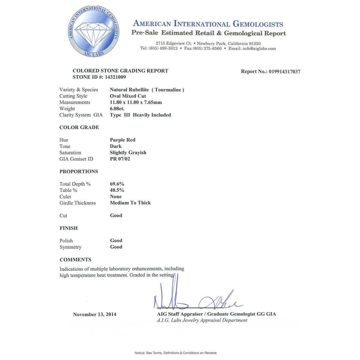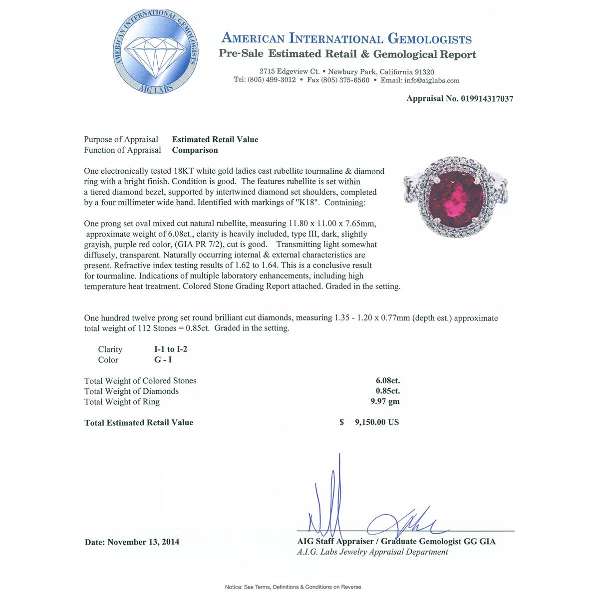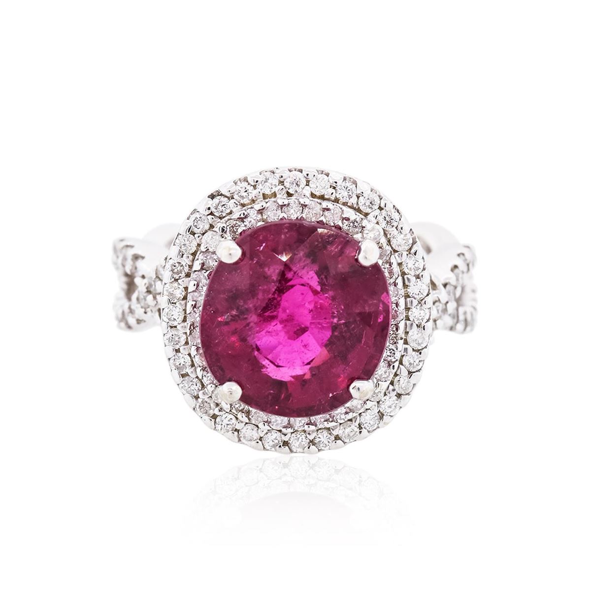 One electronically tested 18KT white gold ladies cast rubellite tourmaline & diamond ring with a bright finish. The features rubellite is set within a tiered diamond bezel, supported by intertwined diamond set shoulders, completed by a four millimeter wide band. Identified with markings of "K18". Condition is good. Containing: One prong set oval mixed cut natural rubellite, measuring 11.80 x 11.00 x 7.65mm, approximate weight of 6.08ct., clarity is heavily included, type III, dark, slightly grayish, purple red color, (GIA PR 7/2), cut is good. Transmitting light somewhat diffusely, transparent. Naturally occurring internal & external characteristics are present. Refractive index testing results of 1.62 to 1.64. This is a conclusive result for tourmaline. Indications of multiple laboratory enhancements, including high temperature heat treatment. Colored Stone Grading Report attached. Graded in the setting. One Hundred Twelve prong set round brilliant cut diamonds, measuring 1.35 - 1.20 x 0.77mm (depth est.) approximate total weight of 112 Stones = 0.85ct. Graded in the setting. Clarity I-1 to I-2. Color G - I. Total Weight of Colored Stones 6.08ct. Total Weight of Diamonds 0.85ct. Total Weight of Ring 9.97 grams. AIG Appraised at $9,150.00.