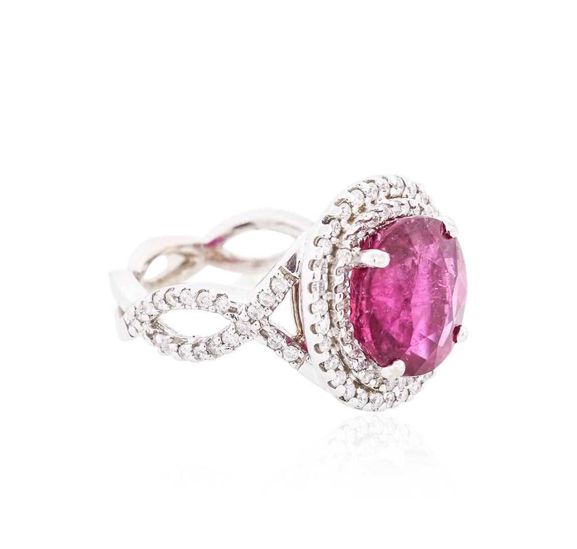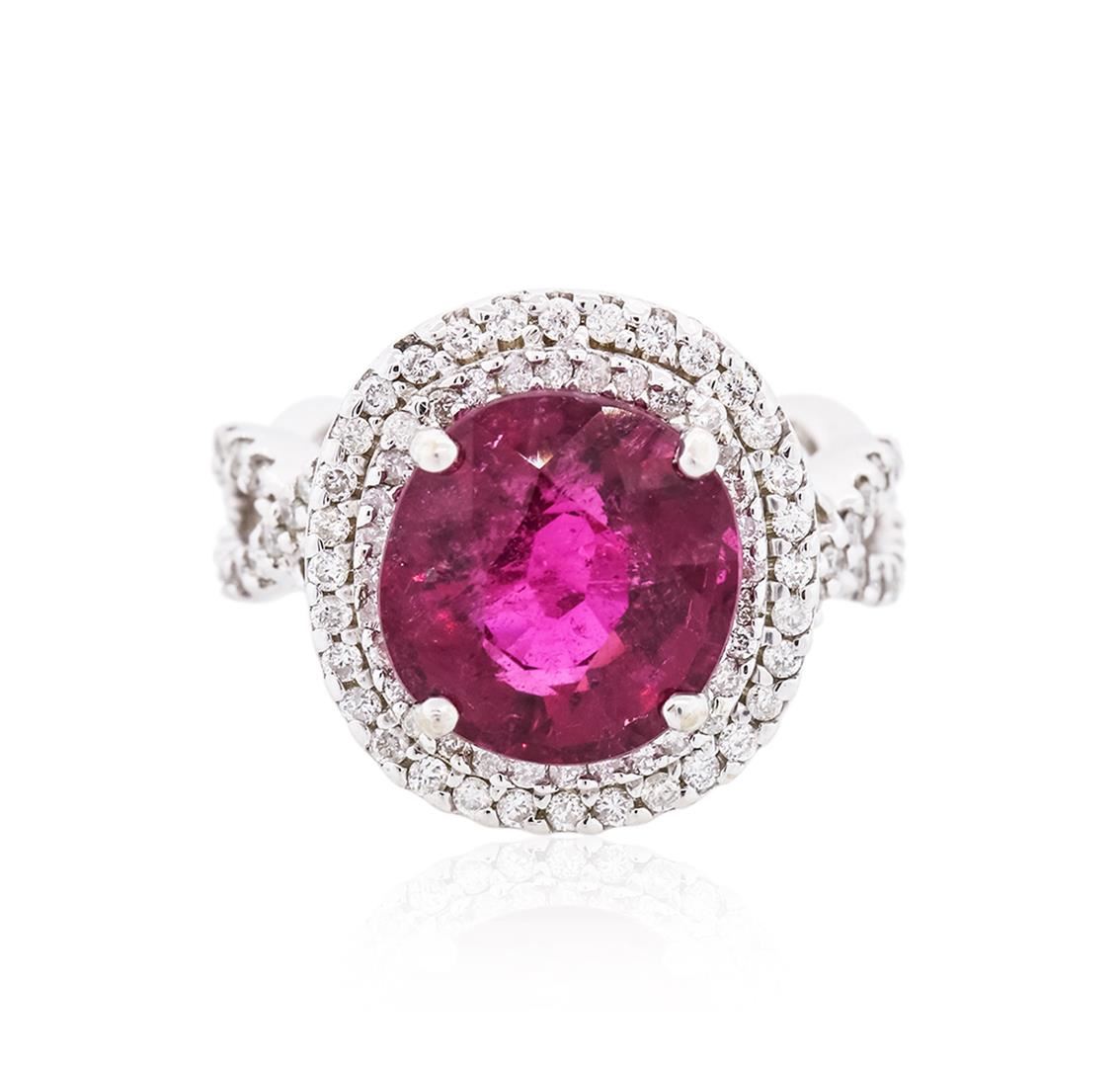 One electronically tested 18KT white gold ladies cast rubellite tourmaline & diamond ring with a bright finish. The features rubellite is set within a tiered diamond bezel, supported by intertwined diamond set shoulders, completed by a four millimeter wide band. Identified with markings of "K18". Condition is good. Containing: One prong set oval mixed cut natural rubellite, measuring 11.80 x 11.00 x 7.65mm, approximate weight of 6.08ct., clarity is heavily included, type III, dark, slightly grayish, purple red color, (GIA PR 7/2), cut is good. Transmitting light somewhat diffusely, transparent. Naturally occurring internal & external characteristics are present. Refractive index testing results of 1.62 to 1.64. This is a conclusive result for tourmaline. Indications of multiple laboratory enhancements, including high temperature heat treatment. Colored Stone Grading Report attached. Graded in the setting. One Hundred Twelve prong set round brilliant cut diamonds, measuring 1.35 - 1.20 x 0.77mm (depth est.) approximate total weight of 112 Stones = 0.85ct. Graded in the setting. Clarity I-1 to I-2. Color G -- I. Total Weight of Colored Stones 6.08ct. Total Weight of Diamonds 0.85ct. Total Weight of Ring 9.97 grams. AIG Appraised at $9,150.00.
