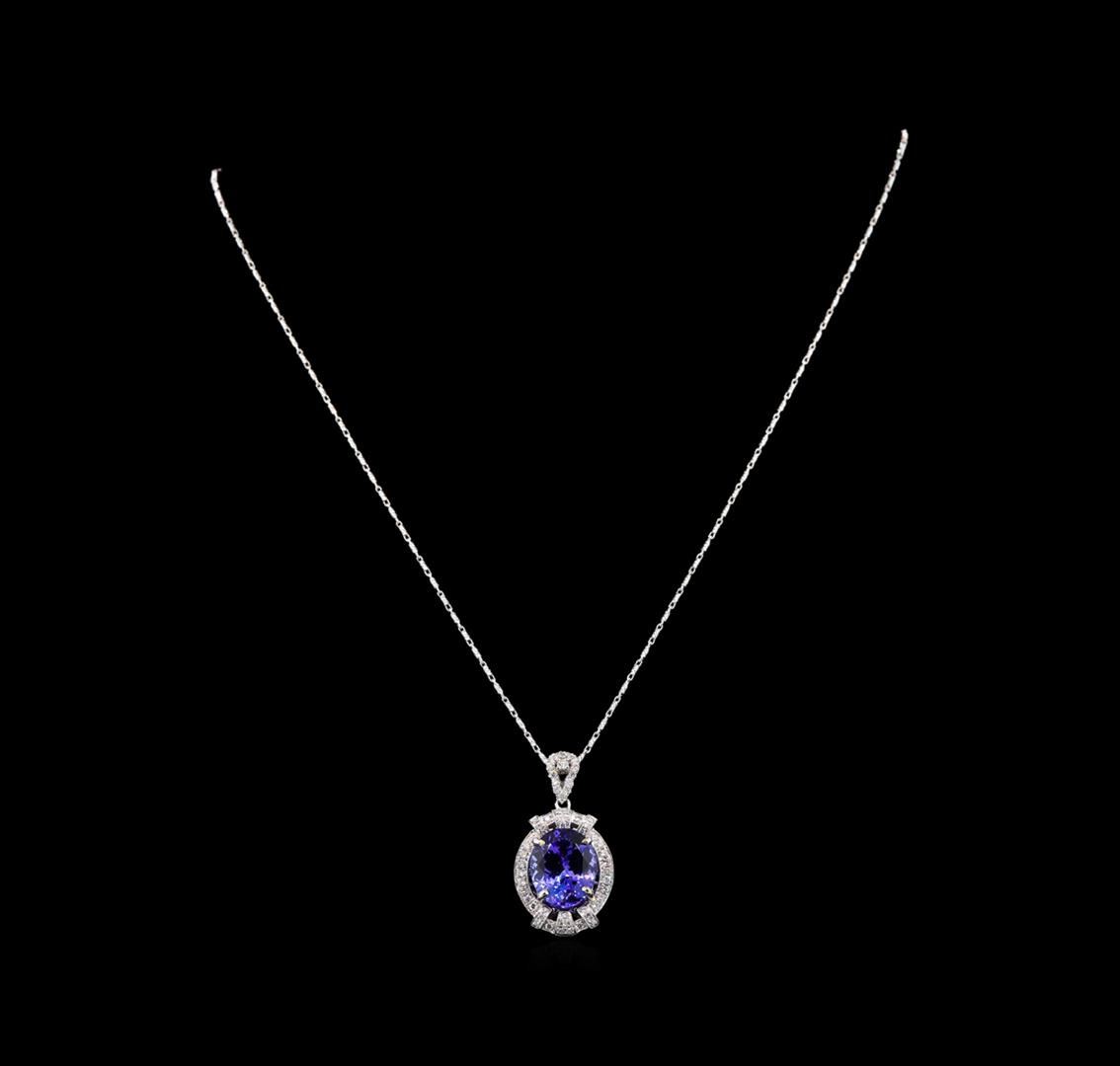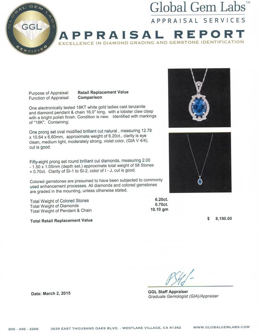 One electronically tested 18KT white gold ladies cast tanzanite and diamond pendant & chain 16.0" long, with a lobster claw clasp with a bright polish finish. Identified with markings of "18K". Condition is new. Containing: One prong set oval modified brilliant cut natural , measuring 12.78 x 10.64 x 6.60mm, approximate weight of 6.20 ct., clarity is eye clean, medium light, moderately strong, violet color, (GIA V 4/4), cut is good. Fifty-Eight prong set round brilliant cut diamonds, measuring 2.00 - 1.50 x 1.05mm (depth est.) approximate total weight of 58 Stones = 0.70 ct. Clarity: SI-1 to SI-2. Color: I - J, Cut is Good. Colored gemstones are presumed to have been subjected to commonly used enhancement processes. All diamonds and colored gemstones are graded in the mounting, unless otherwise stated. Total Weight of Colored Stones 6.20 ct. Total Weight of Diamonds 0.70 ct. Total Weight of Pendant & Chain 10.10 grams. GGL Appraised.