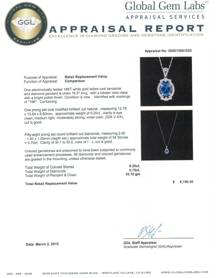 One electronically tested 18KT white gold ladies cast tanzanite and diamond pendant & chain 16.0" long, with a lobster claw clasp with a bright polish finish. Identified with markings of "18K". Condition is new. Containing: One prong set oval modified brilliant cut natural , measuring 12.78 x 10.64 x 6.60mm, approximate weight of 6.20ct., clarity is eye clean, medium light, moderately strong, violet color, (GIA V 4/4), cut is good. Fifty-Eight prong set round brilliant cut diamonds, measuring 2.00 - 1.50 x 1.05mm (depth est.) approximate total weight of 58 Stones = 0.70ct. Clarity: SI-1 to SI-2. Color: I - J, Cut is Good. Colored gemstones are presumed to have been subjected to commonly used enhancement processes. All diamonds and colored gemstones are graded in the mounting, unless otherwise stated. Total Weight of Colored Stones 6.20ct. Total Weight of Diamonds 0.70ct. Total Weight of Pendant & Chain 10.10 grams. GGL Appraised at $8,190.00.