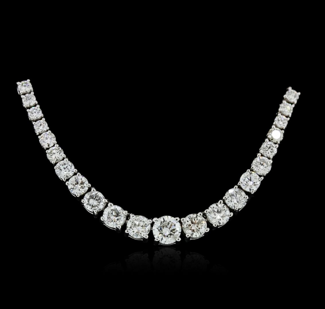 One electronically tested 18KT white gold ladies cast diamond necklace with a hidden box clasp with safety closer with a bright polish finish. Measurements: 16.25" in length Identified with markings of "750". Condition is new. Containing: One prong set round brilliant cut diamond, measuring 4.70 - 4.65 x 2.81mm (depth est.) approximate weight of 0.38ct. Clarity of I-1, Color of J, Cut is Good. Ten prong set round brilliant cut diamonds, measuring 4.00 - 3.70 x 2.31mm (depth est.) approximate total weight of 10 Stones = 2.09ct. Clarity of SI-1 to SI-2, Color of I, Cut is Good. Ninety prong set round brilliant cut diamonds, measuring 2.30 - 2.20 x 1.35mm (depth est.) approximate total weight of 90 Stones = 3.74ct. Clarity of SI-1 to SI-2, Color of I - J, Cut is Good. All diamonds are graded in the mounting, unless otherwise stated. Total Weight of Diamonds 6.21ct. Total Weight of Necklace 18.50 grams. GGL Appraised at $12,700.00.