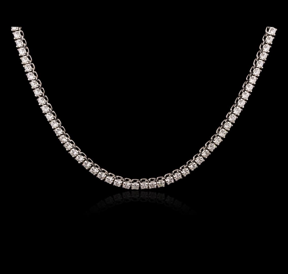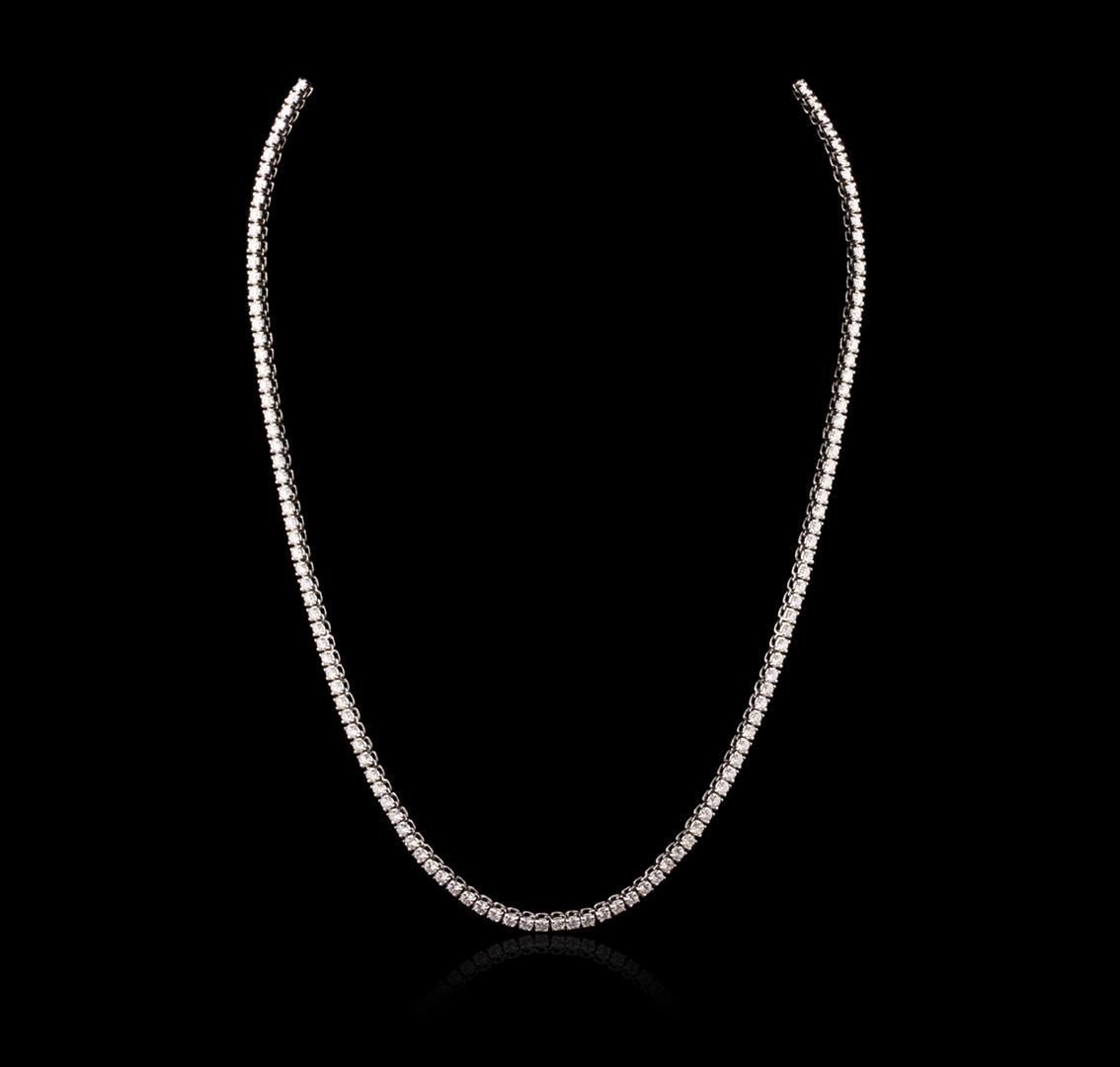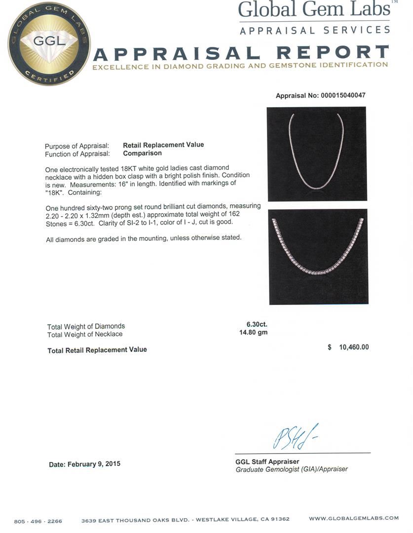 One electronically tested 18KT white gold ladies cast diamond necklace with a hidden box clasp with a bright polish finish. Measurements: 16" in length. Identified with markings of "18K". Condition is new. Containing: One Hundred Sixty-Two prong set round brilliant cut diamonds, measuring 2.20 - 2.20 x 1.32mm (depth est.) approximate total weight of 162 Stones = 6.30ct. Clarity: SI-2 to I-1. Color: I - J, Cut is Good. All diamonds are graded in the mounting, unless otherwise stated. Total Weight of Diamonds 6.30ct. Total Weight of Necklace 14.80 grams. GGL Appraised at $10,460.00.