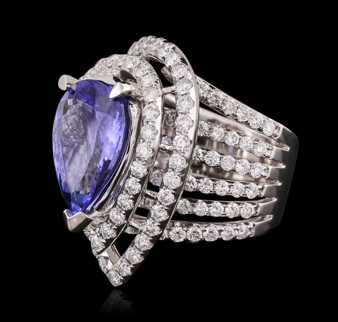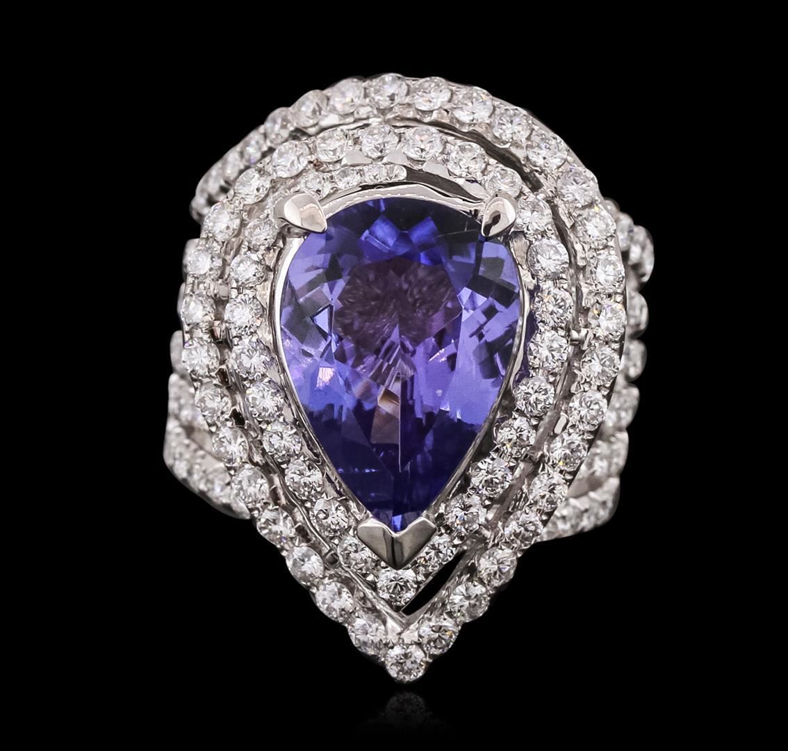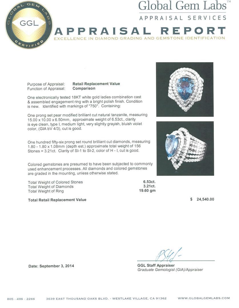 One electronically tested 18KT white gold ladies combination cast & assembled engagement ring with a bright polish finish. Identified with markings of "750". Condition is new. Containing: One prong set pear modified brilliant cut natural tanzanite, measuring 15.00 x 10.00 x 6.50mm, approximate weight of 6.53ct., clarity is eye clean, type I, medium light, very slightly grayish, bluish violet color, (GIA bV 4/3), cut is good. One Hundred Fifty-Six prong set round brilliant cut diamonds, measuring 1.80 - 1.80 x 1.08mm (depth est.) approximate total weight of 156 Stones = 3.21ct. Clarity: SI-1 to SI-2. Color: H - I, Cut is Good. Colored gemstones are presumed to have been subjected to commonly used enhancement processes. All diamonds and colored gemstones are graded in the mounting, unless otherwise stated. Total Weight of Colored Stones 6.53ct. Total Weight of Diamonds 3.21ct. Total Weight of Ring 19.60 grams. GGL Appraised.