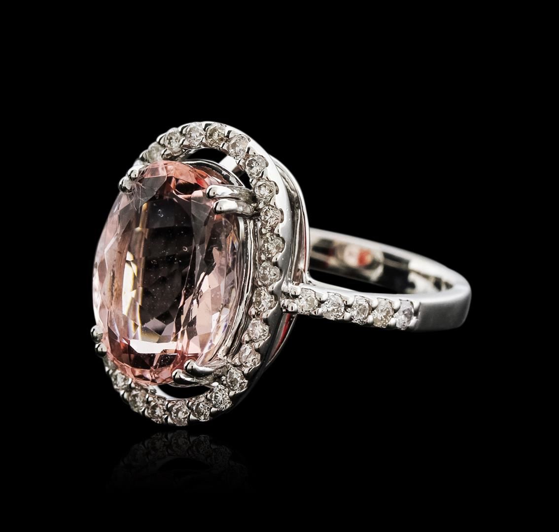 One electronically tested 18KT white gold ladies cast morganite and diamond ring with a flat shank with a bright polish finish. Identified with markings of "18K". Condition is new. Containing: One prong set oval modified step cut natural morganite, measuring 14.20 x 11.00 x 8.03mm, approximate weight of 7.16ct., clarity is eye clean, type I, light, slightly brownish, reddish orange color, (GIA rO 3/2), cut is good. Thirty-Eight prong set round brilliant cut diamonds, measuring 1.50 - 1.50 x 0.90mm (depth est.) approximate total weight of 38 Stones = 0.47ct. Clarity: SI-1. Color: I - J, Cut is Good. All diamonds and colored gemstones are graded in the mounting, unless otherwise stated. Colored gemstones are presumed to have been subjected to commonly used enhancement processes. Total Weight of Colored Stones 7.16ct. Total Weight of Diamonds 0.47ct. Total Weight of Ring 7.00 grams. GGL Appraised at $5,270.00.