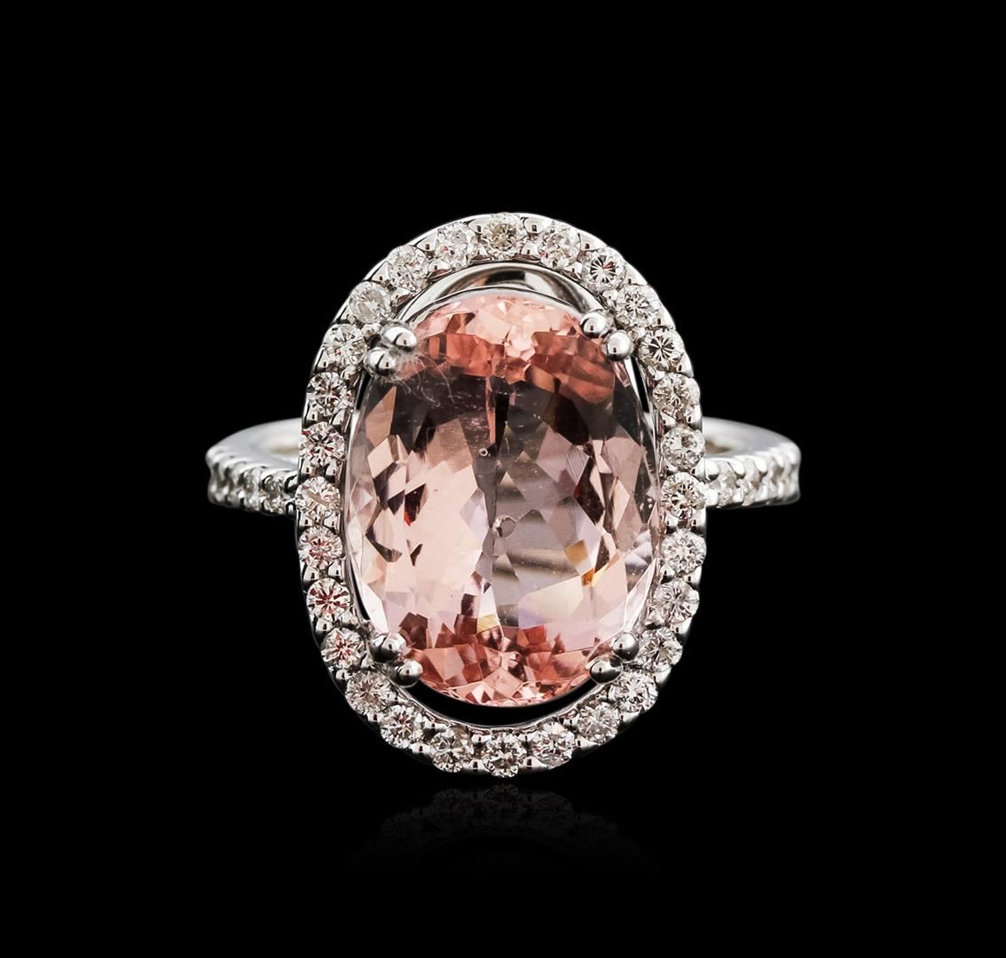 One electronically tested 18KT white gold ladies cast morganite and diamond ring with a flat shank with a bright polish finish. Identified with markings of "18K". Condition is new. Containing: One prong set oval modified step cut natural morganite, measuring 14.20 x 11.00 x 8.03mm, approximate weight of 7.16ct., clarity is eye clean, type I, light, slightly brownish, reddish orange color, (GIA rO 3/2), cut is good. Thirty-Eight prong set round brilliant cut diamonds, measuring 1.50 - 1.50 x 0.90mm (depth est.) approximate total weight of 38 Stones = 0.47ct. Clarity: SI-1. Color: I - J, Cut is Good. All diamonds and colored gemstones are graded in the mounting, unless otherwise stated. Colored gemstones are presumed to have been subjected to commonly used enhancement processes. Total Weight of Colored Stones 7.16ct. Total Weight of Diamonds 0.47ct. Total Weight of Ring 7.00 grams. GGL Appraised at $5,270.00.