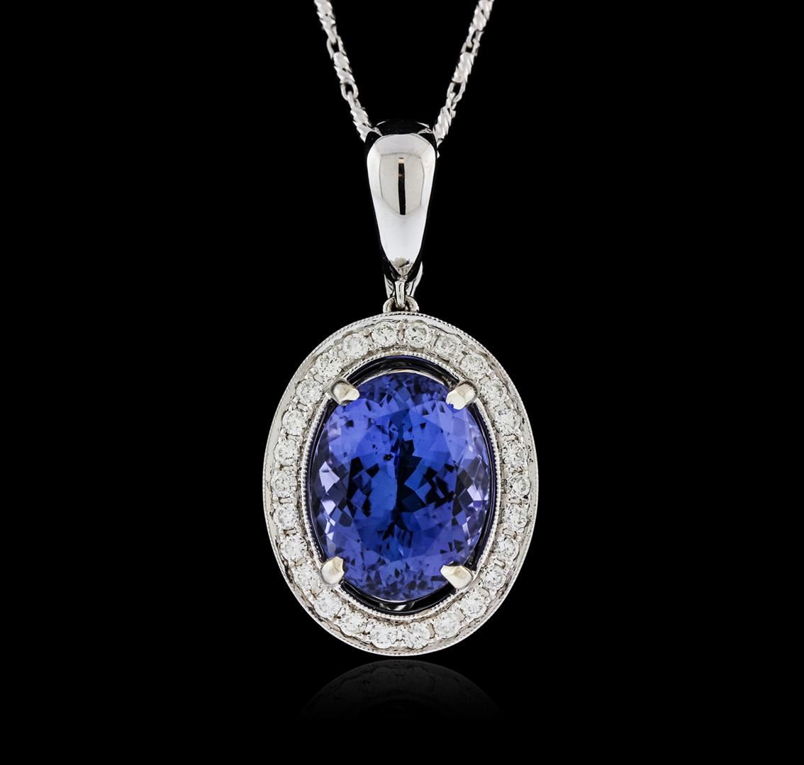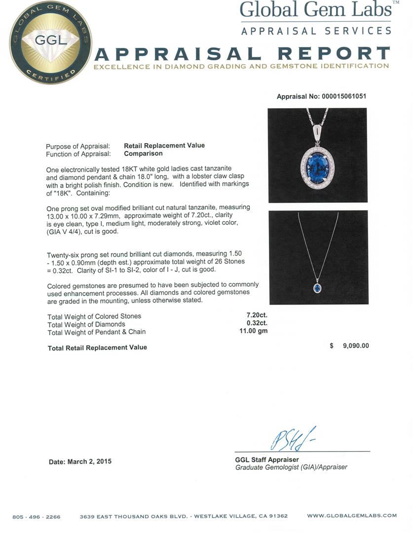 One electronically tested 18KT white gold ladies cast tanzanite and diamond pendant & chain 18.0" long, with a lobster claw clasp with a bright polish finish. Identified with markings of "18K". Condition is new. Containing: One prong set oval modified brilliant cut natural tanzanite, measuring 13.00 x 10.00 x 7.29mm, approximate weight of 7.20ct., clarity is eye clean, medium light, moderately strong, violet color, (GIA V 4/4), cut is good. Twenty-Six prong set round brilliant cut diamonds, measuring 1.50 - 1.50 x 0.90mm (depth est.) approximate total weight of 26 Stones = 0.32ct. Clarity: SI-1 to SI-2. Color: I - J, Cut is Good. Colored gemstones are presumed to have been subjected to commonly used enhancement processes. All diamonds and colored gemstones are graded in the mounting, unless otherwise stated. Total Weight of Colored Stones 7.20ct. Total Weight of Diamonds 0.32ct. Total Weight of Pendant & Chain 11.00 grams. GGL Appraised at $9,090.00.