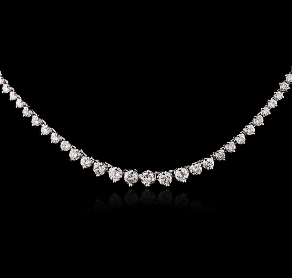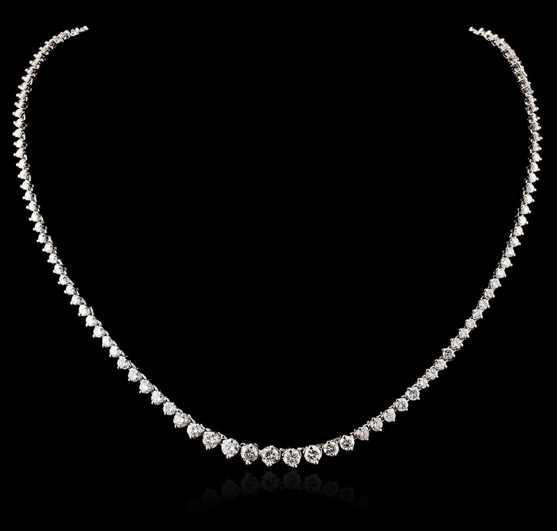 One electronically tested 18KT white gold ladies cast & assembled diamond tennis necklace with a bright polish finish. Sixteen inch length necklace composed of a flexible graduating ribbon of diamonds, terminating in a concealed clasp with safety bar. Identified with markings of "18K". Condition is new, good workmanship. Tennis bracelets & necklaces got their unusual name from an incident involving the U.S. professional tennis player Chris Evert during a tennis match in the 1980's. Evert had been wearing an expensive diamond bracelet, an inline string of individually-set diamonds. Previously these bracelets were known as eternity bracelets. When the clasp snapped during play, she asked the officials to stop the tennis match until the bracelet could be found. Since that day, bracelets and necklaces featuring an inline string of diamonds have been called tennis bracelets and tennis necklaces. Six prong set round brilliant cut diamonds, measuring 4.20 - 4.00 x 2.46mm (depth est.), 6.00% GTCF approximate total weight of 6 Stones = 1.70ct. Graded in the setting. Clarity: SI-1 to SI-2. Color: I - J Four prong set round brilliant cut diamonds, measuring 3.50 - 3.40 x 2.07mm (depth est.) approximate total weight of 4 Stones = 0.70ct. Graded in the setting. Clarity: SI-1 to SI-2. Color: I - J Ten prong set round brilliant cut diamonds, measuring 3.10 - 3.00 x 1.83mm (depth est.) approximate total weight of 10 Stones = 1.13ct. Graded in the setting. Clarity: SI-1 to SI-2. Color: H - J Ten prong set round brilliant cut diamonds, measuring 2.50 - 2.40 x 1.47mm (depth est.) approximate total weight of 10 Stones = 0.63ct. Graded in the setting. Clarity: SI-1 to SI-2. Color: H - J One Hundred Four prong set round brilliant cut diamonds, measuring 2.20 - 1.80 x 1.20mm (depth est.) approximate total weight of 104 Stones = 3.13ct. Graded in the setting. Clarity: SI-1 to I-1. Color: H - J. Total Weight of Diamonds 7.29ct. Total Weight of Tennis Bracelet 20.77 grams. AIG Appraised at $24,900.00.