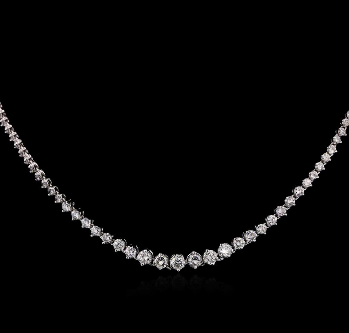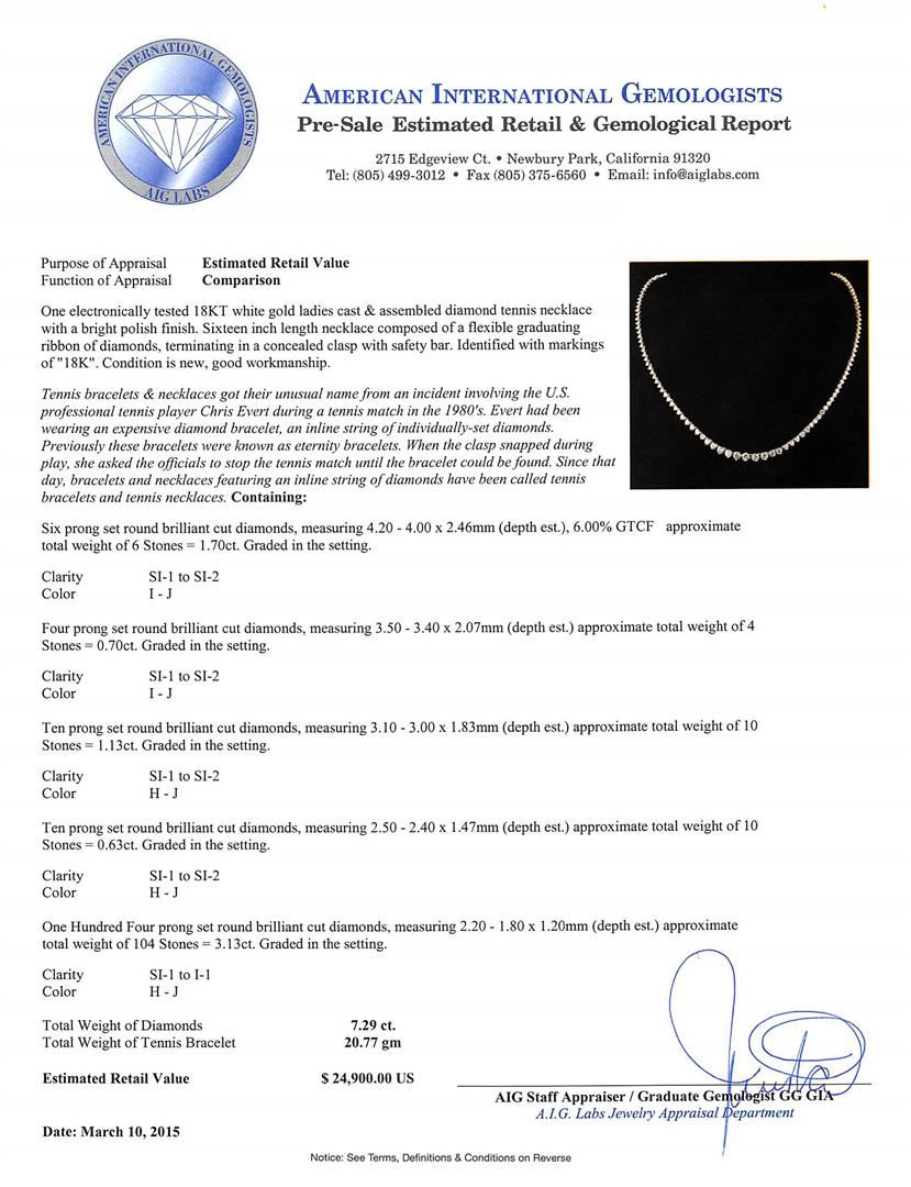 One electronically tested 18KT white gold ladies cast & assembled diamond tennis necklace with a bright polish finish. Sixteen inch length necklace composed of a flexible graduating ribbon of diamonds, terminating in a concealed clasp with safety bar. Identified with markings of "18K". Condition is new, good workmanship. Tennis bracelets & necklaces got their unusual name from an incident involving the U.S. professional tennis player Chris Evert during a tennis match in the 1980's. Evert had been wearing an expensive diamond bracelet, an inline string of individually-set diamonds. Previously these bracelets were known as eternity bracelets. When the clasp snapped during play, she asked the officials to stop the tennis match until the bracelet could be found. Since that day, bracelets and necklaces featuring an inline string of diamonds have been called tennis bracelets and tennis necklaces. Six prong set round brilliant cut diamonds, measuring 4.20 - 4.00 x 2.46mm (depth est.), 6.00% GTCF approximate total weight of 6 Stones = 1.70ct. Graded in the setting. Clarity: SI-1 to SI-2. Color: I - J Four prong set round brilliant cut diamonds, measuring 3.50 - 3.40 x 2.07mm (depth est.) approximate total weight of 4 Stones = 0.70ct. Graded in the setting. Clarity: SI-1 to SI-2. Color: I - J Ten prong set round brilliant cut diamonds, measuring 3.10 - 3.00 x 1.83mm (depth est.) approximate total weight of 10 Stones = 1.13ct. Graded in the setting. Clarity: SI-1 to SI-2. Color: H - J Ten prong set round brilliant cut diamonds, measuring 2.50 - 2.40 x 1.47mm (depth est.) approximate total weight of 10 Stones = 0.63ct. Graded in the setting. Clarity: SI-1 to SI-2. Color: H - J One Hundred Four prong set round brilliant cut diamonds, measuring 2.20 - 1.80 x 1.20mm (depth est.) approximate total weight of 104 Stones = 3.13ct. Graded in the setting. Clarity: SI-1 to I-1. Color: H - J. Total Weight of Diamonds 7.29ct. Total Weight of Tennis Bracelet 20.77 grams. AIG Appraised at $24,900.00.