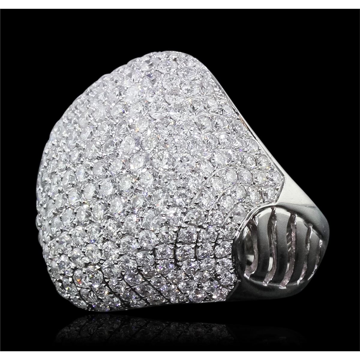 One electronically tested 18KT white gold ladies cast diamond ring with a bright polish finish. Condition is new, good workmanship. The ring features an elaborate diamond set curvature, completed by a six and one-half millimeter wide band. Identified with markings of "750". Containing: Two Hundred Seventy-One pav‚ set round brilliant cut diamonds, measuring 2.10 - 1.80 x 1.17mm (depth est.) approximate. Total Weight of 271 Stones = 7.44ct. Graded in the setting. Clarity: SI-1 to I-1. Color: F - H. Total Weight of Diamonds 7.44ct. Total Weight of Ring 20.40 grams. AIG Appraised at $28,860.00.